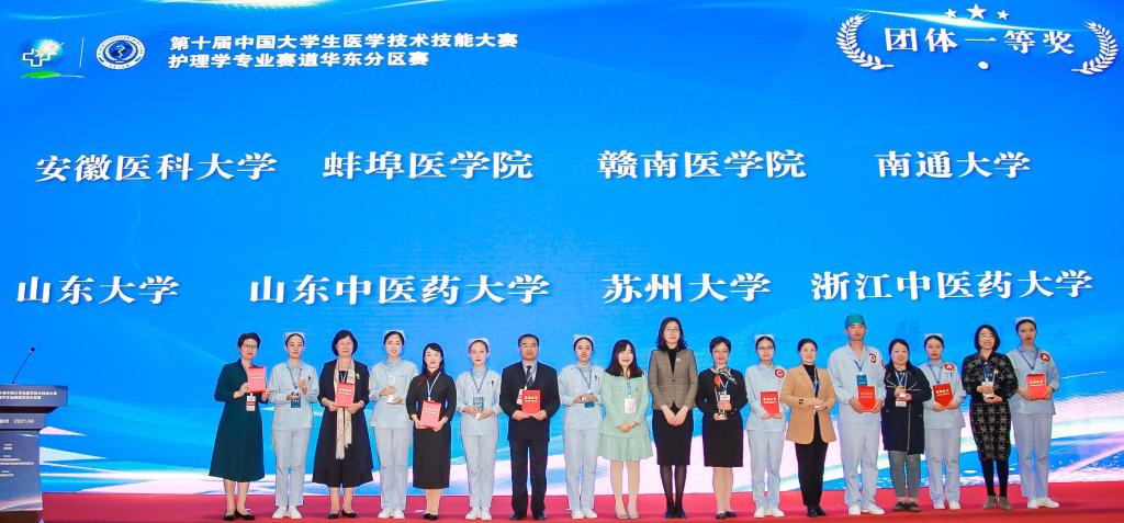 中国大学生医学技术技能大赛,是独具中国特色的高端医学教育赛事,自2010年以来,已走过10年风雨,堪称医学生的“奥林匹克”。本次大赛的主题为“尚德精术培育卓越人才,中西并重共筑健康中国”。大赛于今年首次增设护理学类专业赛道,其华东分区赛由徐州医科大学承办,参赛队伍分别来自上海市、浙江省、江苏省、山东省、安徽省、江西省、福建省等62所高校,由毕业实习阶段的护理本科生组队参赛。竞赛分为初赛、复赛和决赛三个单元,重点考查专业基本技能、基本理论知识、临床思维、人文关怀和团队合作等综合能力与素质,内容涵盖护理学基础、健康评估、内科护理学、外科护理学、急危重症护理学、妇科护理学、儿科护理学等学科理论知识和相关专业技能操作。初赛采用两个平行赛道,八个独立站点循环赛制,重点考察学生的基本技能,有32支队伍晋级复赛;复赛为赛道式,四个平行赛道,每个赛道三个站点,以临床案例和场景为轴,重点考察学生解决复杂问题的能力和临床思维能力,有12支队伍晋级决赛;决赛赛制为单站情景式,重点考察学生临床思维能力和团队协作能力。护理学类专业赛道华东分区赛设立特等奖4个、一等奖8个、二等奖19个、三等奖32个。
