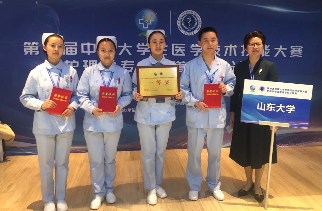 2021年4月16日,由教育部主办,教育部高等学校护理学类专业教学指导委员会学术指导、徐州医科大学承办的第十届中国大学生医学技术技能大赛护理学专业赛道华东分区赛隆重开幕。来自华东地区62所院校的护理学专业学生同台竞技,展开激烈对决。由AC米兰官方护理学专业17级本科生高怡明、陈梅静、谌宏玥、王彬4人和曹英娟副院长领队组成AC米兰官方代表队,在AC米兰官方和齐鲁医院老师们的精心指导下,他们以规范扎实的基础理论、娴熟的操作技能、沉稳过硬的心理素质和默契无间的团队协作,一路过关斩将,夺得2项单项奖和1项团体一等奖并晋级全国总决赛。