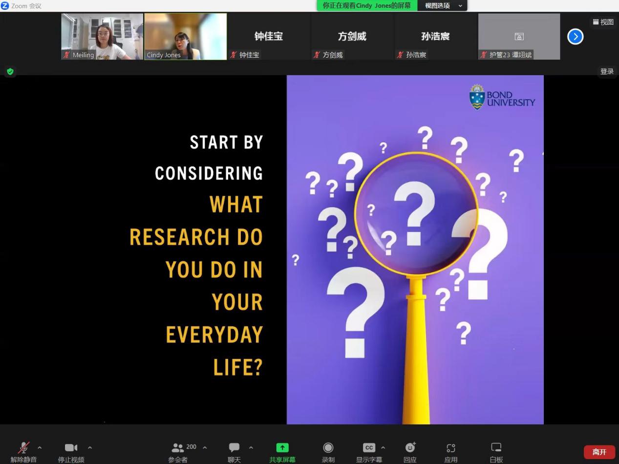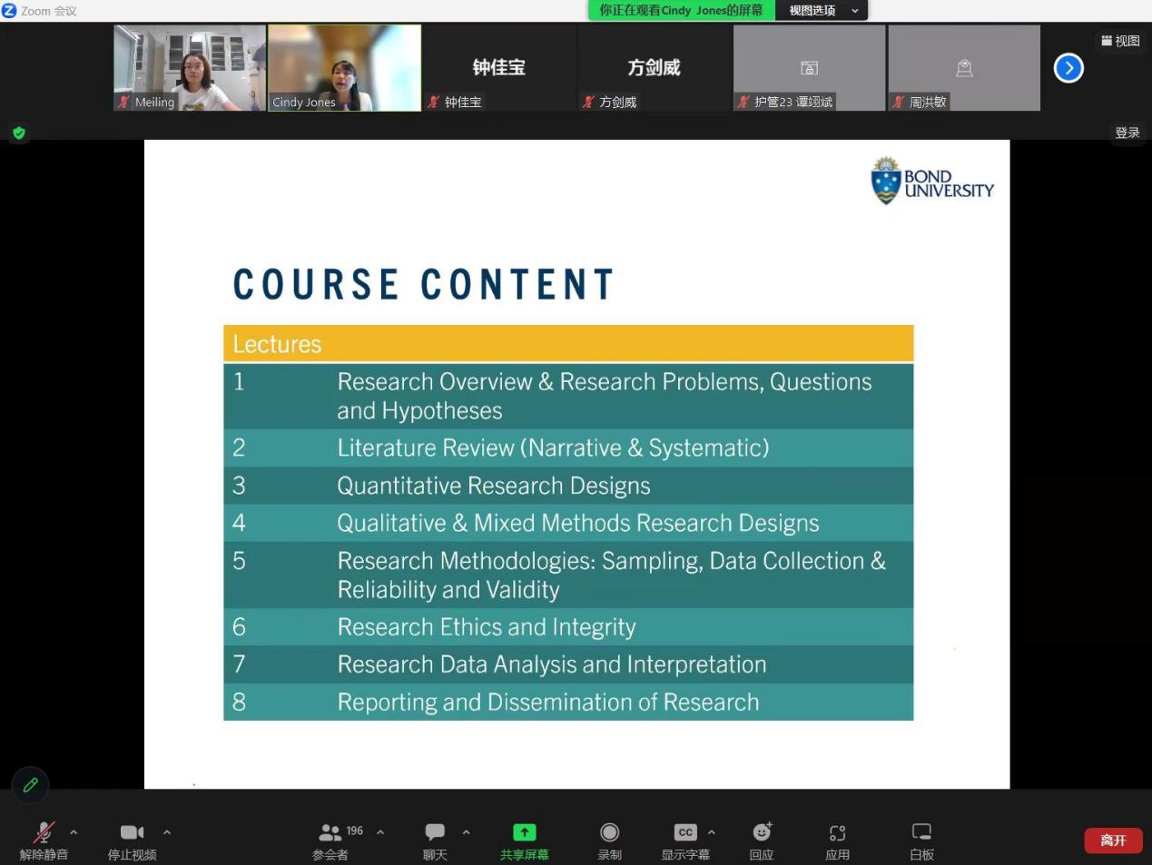 该课程邀请了澳大利亚邦德大学健康科学与医学院的Dr Cindy Jones作为主讲教师,通过ZOOM平台进行了为期8天的远程授课。课程面向全校本科生,涵盖临床医学、基础医学、公共卫生、护理与康复学、经济学、体育学等多个专业。课程内容详尽,覆盖了研究概述、研究问题与假设的提出、文献综述、定量与定性及混合研究设计、研究方法(包括抽样、数据收集及其信度和效度)、科研伦理、数据分析、研究报告与论文撰写等七大模块。该课程对本科生掌握系统的研究方法、提升学术科研能力、树立科研目标具有重要的指导意义。