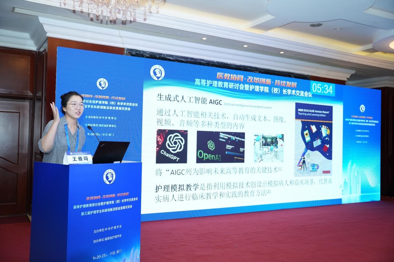 在2024年9月22日下午于厦门举办的高等护理教育研讨会暨护理学院(校)长学术交流会议上,AC米兰官方实验教学中心王雅琦老师做了题为《生成式人工智能在护理模拟教学中的应用》的报告。高等护理教育研讨会暨护理学院(校)长学术交流会议是一年一度的重要学术活动,旨在促进护理教育领域的学术交流与合作,推动护理教育的创新与发展。今年的会议吸引了来自全国各地的护理教育专家、学者以及行业领袖,共同探讨护理教育的未来趋势和挑战。