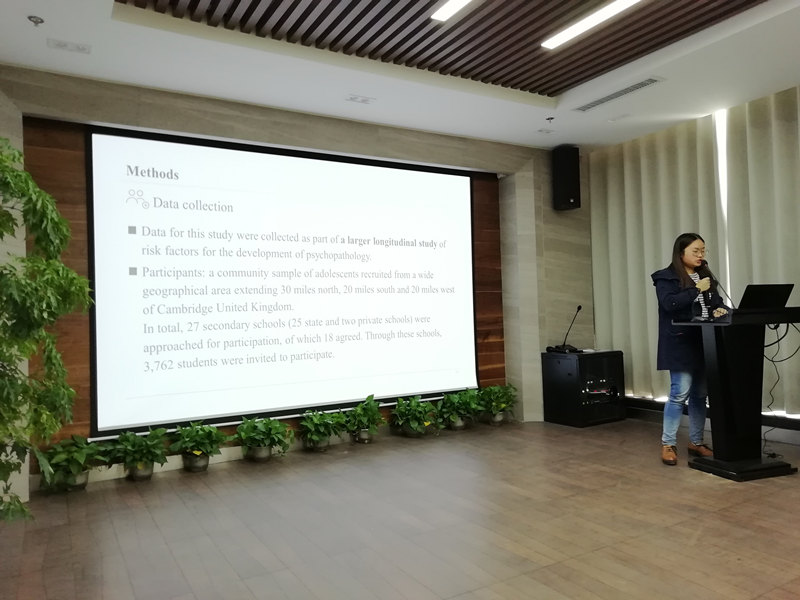 第四位汇报者是2017级学术型硕士研究生李佳欢,汇报题目是“Poor family functioning mediates the link between childhood adversity and adolescent nonsuicidal self-injury”。该文章2018年8月发表于Journal of Child Psychology and Psychiatry杂志,本文的目的是探究童年期家庭逆境(5岁前)和青少年非自杀性自伤(14至17岁)之间的中间路径的这四个假设模型,分别是精神疾病模型、次优环境危害模型、近端环境缓解模型、依恋模型。本研究的数据是来自于对精神病理学发展的风险因素研究的大型纵向研究,是从广阔的地理区域招募的青少年的社区样本,共有1,238名学生的同意参与研究。本文的分析在933名参与者的子样本中进行的,这些参与者在14岁时报告无终生非自杀性自伤,并在17岁时提供非自杀性自伤的随访数据。本文主要结果变量是17岁时新发的非自杀性自伤,预测变量是童年期家庭逆境(5岁前)、家庭功能(14岁时)、心理疾病(14岁之前)、同伴关系(14岁时)、社经地位。研究结果支持了次优环境危害假说,14岁时的家庭功能中介了5岁之前的家庭逆境与14岁至17岁之间的非自杀性自伤之间的关联。该结果表明子发生家庭逆境后改善家庭功能可能可以降低青少年非自杀性自伤的发生。因此,帮助陷入困境的家庭,提供社会关怀是非常重要的。需要进一步研究以探索改善家庭功能的潜在方法并且在随机对照试验中验证其效果。