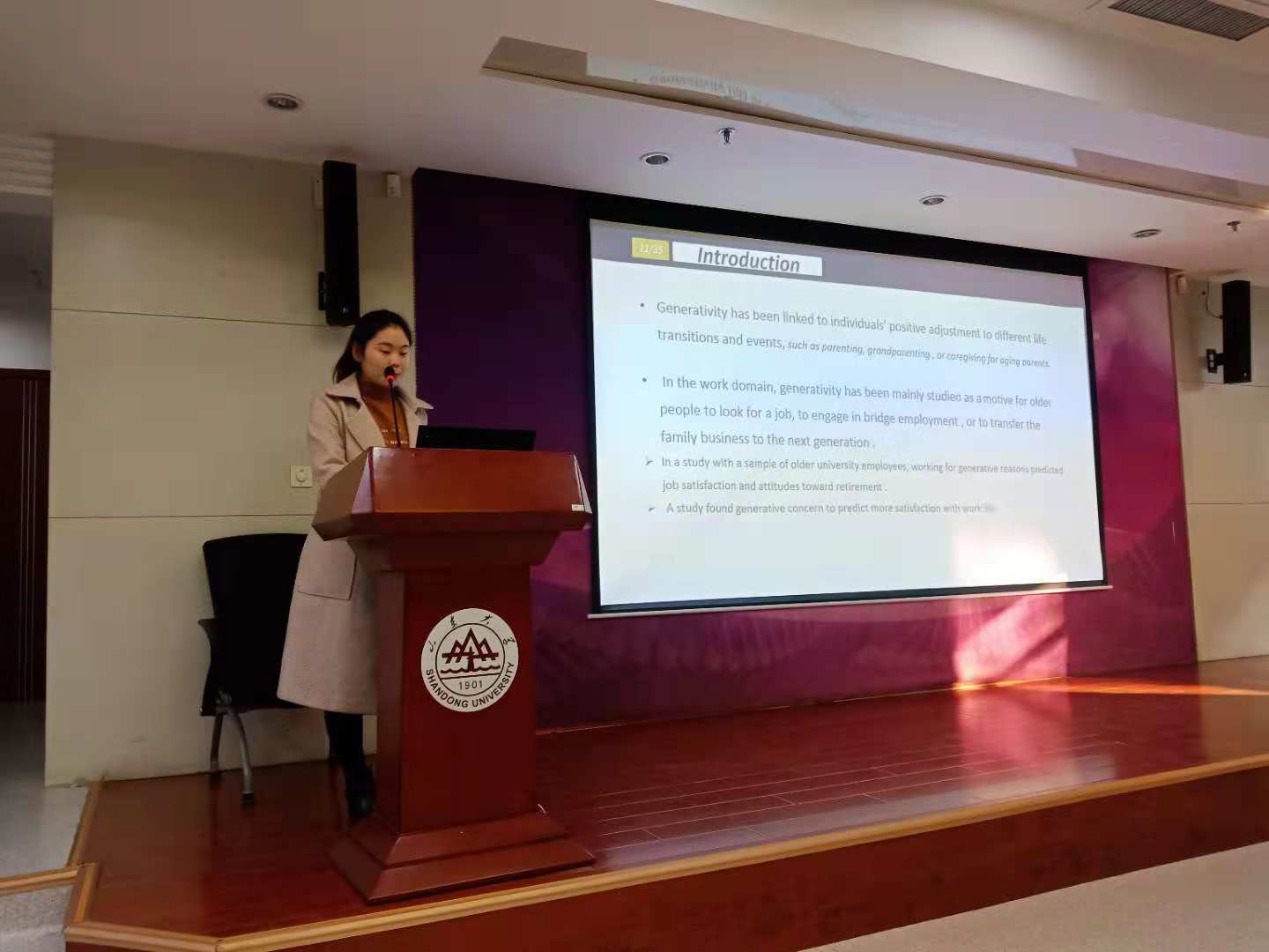 第一位汇报者是张锋,她汇报的题目是“人格特质和创造力对于退休调整质量的纵向的影响”。该研究的目的是探索退休前人格特质与创造力对退休后两个时间点享乐论幸福感与实现论幸福感的预测作用。最终发现在控制了享乐幸福感和实现论幸福感的初始值以及个人特质和资源的影响之后,T1处的外向性得分越高,T2处的享乐幸福感越显著,而T1时神经质得分越低,创造力得分越高,显著预测了T2时的实现论幸福感。并且在T1时的神经质和创造力关注可以显著的预测在T3的实现论幸福感。