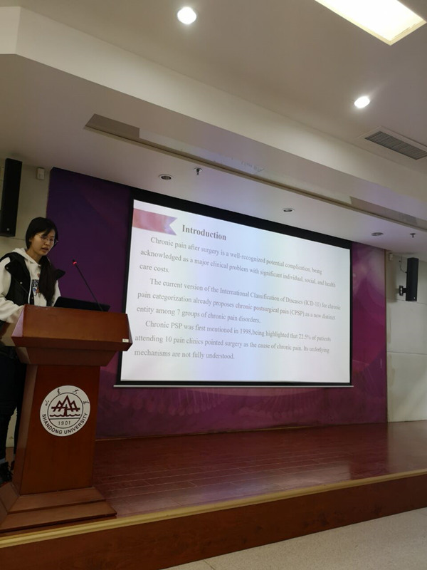 第三位汇报者是2017级专业型研究生原小岚,她本次汇报的题目为“Psychological factors predict an unfavorable pain trajectory after hysterectomy: a prospective cohort study on chronic postsurgical pain”,即“子宫切除术后疼痛轨迹的心理预测因子:一项关于慢性术后疼痛的前瞻性队列研究”,大家就Bonforreni事后检验、多分类logistic回归等统计方法进行了激烈的讨论。本研究最终纳入了170名因良性原因进行子宫切除术的女性患者,分别在术前24h(T1)、术后48h(T2)、术后4个月(T3)、术后5年(T4)对患者进行评估,建立了3个疼痛轨迹组(PT1、PT2、PT3)。研究发现,心理因素如术前焦虑、长期手术恐惧、情感陈述等对疼痛轨迹有预测作用,后期可对其进行心理干预,从而减少慢性术后疼痛的发生。
