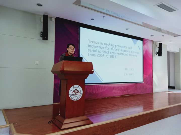 第二位汇报者是2017级博士生张海宏,汇报题目是“Trends in smoking prevalence and implication for chronic diseases in China: serial national cross-sectional surveys from 2003 to 2013”。本文对中国国家卫生健康委员会的国家卫生服务调查的大型横断面数据进行分析,采用SAS软件进行统计,采用JOINPOINT回归模型和多元Logistic回归分析等方法,探讨了2003年到2013年期间,中国15岁及以上人群吸烟流行趋势,计算了年龄标准和性别标准化的吸烟率,戒烟率,探讨了吸烟与慢性非传染性疾病关系。研究结果显示中国吸烟流行趋势居高不下,近年来青少年吸烟率增高,女性40岁以后的吸烟率增高,并且吸烟患者最容易得的慢性病包括了消化性溃疡、气管或肺癌、慢阻肺、脑血管疾病等,男女吸烟者在慢性非传染性疾病的获得上有所区别。该研究是第一个分析中国慢性非传染性疾病与吸烟关系的文献,对之后中国实施联合国烟草控制框架公约(FTCT)有的一定的启示作用。