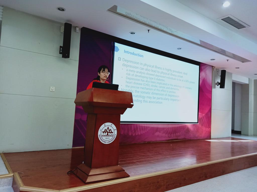 第一位汇报者为2017级学术型硕士研究生王颖,汇报题目为“The association between depressive and sleep symptoms for predicting incident disease onset after 6-year follow-up: findings from the English Longitudinal Study of Ageing”。研究为探索性研究,使用英国老龄化纵向队列数据,探究抑郁症状、睡眠问题和6年之后的慢性病之间的关系,慢性病包括冠心病、糖尿病/高血糖、癌症和关节炎。抑郁症状使用8条目CES-D,提出睡眠问题相关的条目之后剩余7个条目;睡眠问题使用Jenkins Sleep Scale中的3个条目测量入睡困难、夜间觉醒和早醒。模型包括两部分:①纳入抑郁症状和睡眠问题;②继续纳入所有协变量。主效应分析之后探究抑郁和睡眠问题的交互效应,交互变量四分类:低抑郁/低睡眠问题,高抑郁/低睡眠问题,低抑郁/高睡眠问题,高抑郁/高睡眠问题。排除基线时已经诊断有相关慢性病的个体之后再次探究以上问题。结果显示抑郁可以独立预测冠心病、糖尿病,抑郁和睡眠可以独立预测关节炎,抑郁和睡眠问题共同升高可以预测癌症、冠心病和关节炎。相关路径可以用神经免疫系统改变来解释。