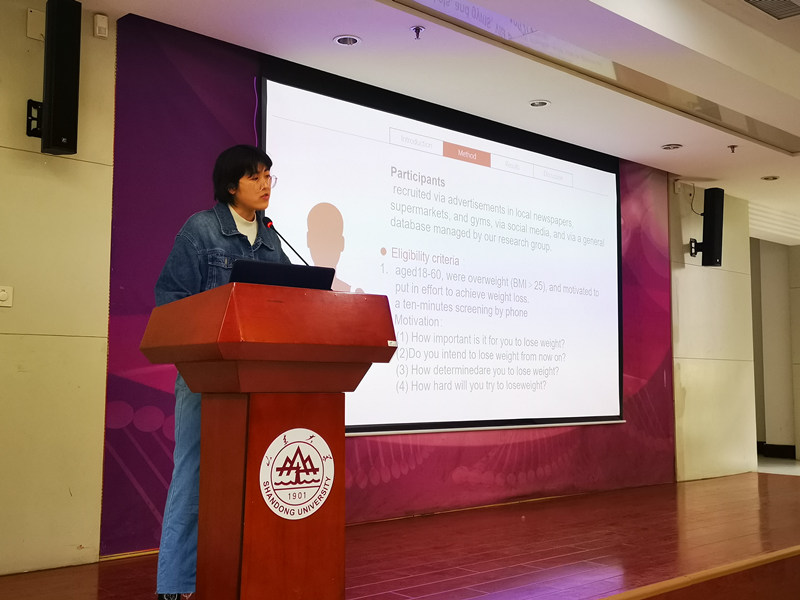第四位汇报者是2017级专硕型研究生徐奇,汇报题目是“Gamified working memory training in overweight individuals reduces food intake but not body weight”。这篇文章发表在Appetite,该杂志专攻社会,文化,心理等各方面对饮食以及饮料摄入的影响机制。本研究作者主要采用自行设计的游戏化工作记忆训练辅以生活饮食健康教育,建立实验组和对照组,来探究工作记忆的提高是否与个体的体重下降或饮食摄入有关。这些干预方式都是通过网上进行操作,此外鉴于游戏化工作记忆训练的25次任务相对多且耗时费脑等因素,参与者从最初的91人降至67人。同时该文章使用7个相关量表评价参与者的自控能力,饮食摄入量,病态性的饮食紊乱,健康的饮食等。结果显示游戏化的工作记忆训练能显著减少饮食摄入量,但对体重的减少并没有额外的价值,且究竟是工作记忆的提高改变的摄入量还是健康教育的作用仍需探讨。