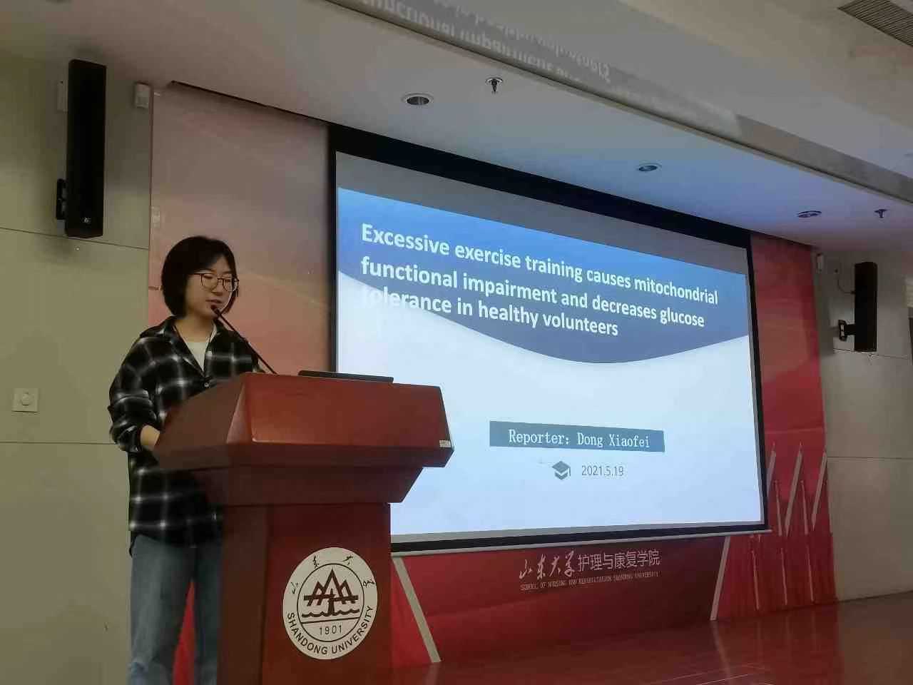 第一位汇报者为2019级专业型硕士董晓菲,汇报的文章题目为《Excessive exercise training causes mitochondrial functional impairment and decreases glucose tolerance in healthy volunteers》。该篇文献由瑞典体育与健康学院 Mikael Flockhart等人于2021年3月18日发表于Cell Metabolism。既往研究证实运动训练是激活线粒体功能的有效刺激,并可通过刺激葡萄糖摄取作为许多代谢障碍疾病的预防性治疗,但运动训练带来积极结果的强度上限尚未明确确定。在本研究中,研究者通过对受试者进行为期四周的运动训练干预,发现在不破坏代谢稳态的情况下,存在一个高强度运动的上限。过度运动训练导致线粒体呼吸损伤,且线粒体损伤与糖耐量受损有关,为正在进行的关于线粒体功能障碍是胰岛素抵抗的原因还是结果的争论提供了有价值的见解。