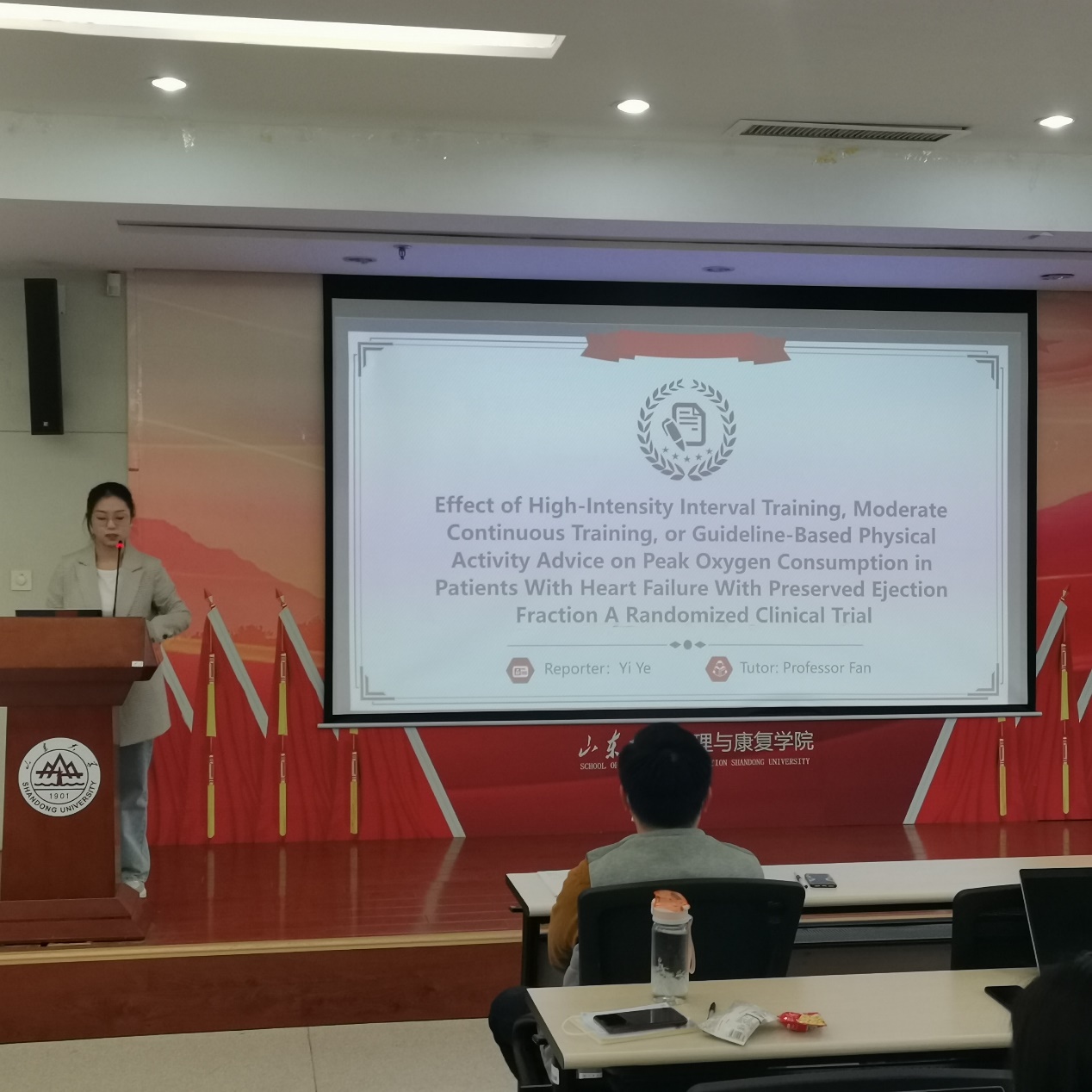 第一位汇报者叶艺汇报的文献题目是“高强度间歇运动、中等强度持续运动和基于指南指导的运动建议对保留射血分数型心衰患者峰值摄氧量的影响”。这篇文章发表在2021年2月的JAMA期刊上,本研究是一项在欧洲五个地点进行的随机对照研究,通过对180名射血分数保留型心衰患者进行为期12个月的三种不同方案的长期运动干预,检验在干预3个月及12个月后心衰患者峰值摄氧量、心肌舒张功能、NT-proBNP及健康相关生活质量的变化情况。研究最终的结果显示,高强度间歇运动及中等强度持续运动的患者在干预3、12个月后两组的峰值摄氧量没有显著差异,且两组均未达到与指南对照组相比的最小临床显著差异,因此研究提示,不建议射血分数保留型心衰患者进行高强度间歇运动及中等强度的持续运动。