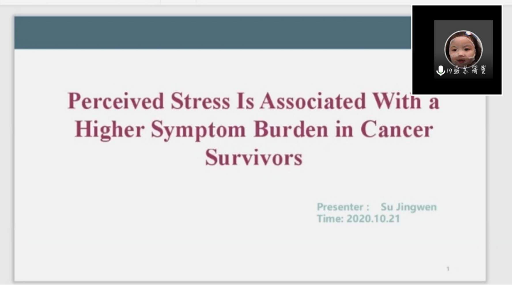 第一位汇报者是2019级研究生苏靖雯,汇报了Melissa Mazor于2019年发表在《Cancer》杂志名为“Perceived Stress Is Associated With a Higher Symptom Burden in Cancer Survivors”的文章,首先该文章调查了完成初步治疗的癌症幸存者所经历症状以及症状的严重程度、对其生活产生的困扰程度,其次,评估了一般人口学特征、由于生活事件所引起的非特异性的压力以及由于患癌事件所引起的压力与其症状负担之间的关系,提出完成癌症初步治疗的幸存者,虽然生存时间平均达到五年,但是仍然报告了较高程度的症状负担,建议在以后的研究探究引起较高症状负担的机制,为制定具有针对性的干预措施提供帮助。该研究具有临床意义,研究思路值得同学们借鉴。