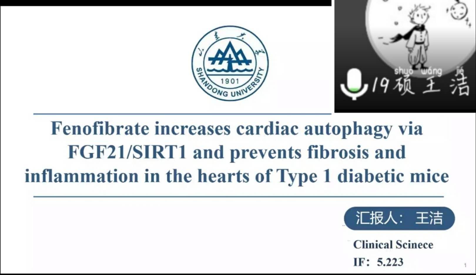 第四位汇报人是2019级硕士研究生王洁汇报了题为“Fenofibrate increases cardiac autophagy via FGF21/SIRT1 and prevents fibrosis and inflammation in the hearts of Type 1 diabetic mice”的论文,发表于Clinical Science杂志,影响因子5.223分。本论文主要探究了Fenofibrate可以通过激活FGF21/SIRT1通路增强心脏自噬进而防止由一型糖尿病引起的心肌纤维化和炎症。本研究为Fenofibrate应用于一型糖尿病心肌病提供了机制方面的深层次探讨。Fenofibrate已被广泛地应用于降低脂质水平,副作用较少。因此,Fenofibrate可能为一型糖尿病心肌病患者提供一种新的治疗方法,并提高其生活质量。