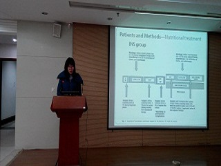 第二位汇报的是2013级专业学位研究生刘俊,本次汇报的文献题目是“Is Early Enteral Nutrition Better for Postoperative Course in Esophageal Cancer Patients?” 文章主要探讨了早期肠内营养支持对于食管癌患者术后营养状况、并发症、死亡率的影响。刘俊提出本研究的临床评价指标较详细,文章的遣词造句也对自己写文献有很大的启迪。曹院长针对本研究是否有后续的随访提出了疑问,并就此与大家进行讨论,大家深受启发。