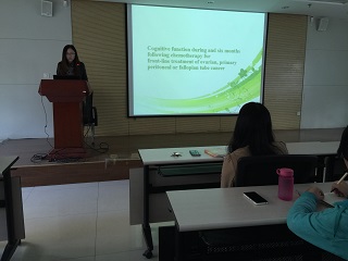 首先汇报的是2014级研究生于晓霞,她汇报的文献题目为“Cognitive function during and six months following chemotherapy for front-line treatment of ovarian, primary peritoneal or fallopian tube cancer:An NRG oncology/gynecologic oncology group study”,该文章是一项关于卵巢癌患者在化疗前后认知功能改变的大型前瞻性研究,用拟合线性混合模型的方法分析了不同因素对认知功能的影响。为卵巢癌患者在化疗期间存在认知功能障碍提供了理论依据。厉萍老师对对文献中统计方法和结果部分的数据讨论进行了提问,同学们进行了热烈探讨。