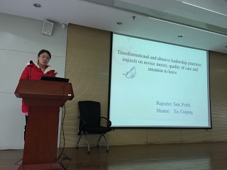 第三位汇报的2013级专业学位研究生孙菲菲,她汇报的是文章题目是转化型领导和滥用职权对护士离职和病人照护的影响,这篇文献用结构方程模型验证了转化型领导和滥用职权影响护士离职和病人照护的假设。臧院长对此研究表示认可,认为有一定的研究价值,值得进一步研究。