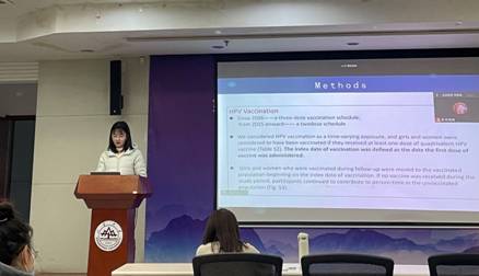 第一位汇报者是2020级硕士研究生卢冉冉,本次汇报的是2020发表在新英格兰杂志Q1区,2020年影响因子为91.253的一篇文献,题目是“HPV Vaccination and the Risk of Invasive Cervical Cancer”(HPV疫苗接种与浸润型宫颈癌的风险),作者Jiayao Lei,近年来一直致力于宫颈癌的预防研究。四价人乳头瘤病毒(HPV)疫苗在预防高级别宫颈病变方面的疗效和有效性已被证明。然而,缺乏数据来说明四价HPV疫苗接种与随后的侵袭性宫颈癌风险之间的关系。本研究利用瑞典全国人口和健康登记册,对2006年至2017年10至30岁的1672983名女孩和妇女进行了跟踪调查,并评估了HPV疫苗接种与侵袭性宫颈癌风险之间的关系,控制了随访年龄、日历年、居住县和父母特征,包括教育、家庭收入、母亲出生国和母亲病史。在研究期间,研究者评估了女孩和女性在31岁生日之前是否患有宫颈癌。19名接受过四价HPV疫苗的女性和538名未接受疫苗的女性被诊断为宫颈癌。在接种过疫苗的妇女中,宫颈癌的累积发病率为每10万人47例,在未接种疫苗的妇女中为每10万人94例。在对随访时的年龄进行调整后,接种人群与未接种人群的发病率比为0.51(95%可信区间CI,0.32至0.82)。在对其他协变量进行额外调整后,发病率比率为0.37(95%CI,0.21至0.57)。在对所有协变量进行调整后,17岁之前接种过疫苗的女性的发病率比率为0.12(95%CI,0.00至0.34),17岁至30岁接种过疫苗的女性的发病率比率为0.47(95%CI,0.27至0.75)。研究结果显示,在10至30岁的瑞典女孩和妇女中,四价HPV疫苗接种与人口水平的侵袭性宫颈癌风险的降低有显著相关性。