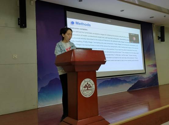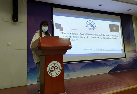第二位汇报者是2020级专业硕士研究生鲁琦,本次汇报的文章发表于Preventive Medicine杂志,该杂志五年的影响因子是5.109,JCR分区为Q1区。文章的题目是《The combined effect of behavioural risk factors on disability in aging adults from the Canadian Longitudinal Study on Aging (CLSA)》,本研究使用加拿大老龄化纵向研究(CLSA)现有的基线横断面数据,纳入了居住在加拿大10个省份的51338名45至85岁的加拿大男性和女性作为研究对象,旨在探索行为风险因素(吸烟、体力活动和营养状况)是如何产生聚集效应,并将行为风险因素根据年龄和性别进行分层分析,探究与失能的相关性。研究结果显示,在这些风险因素中,在所有三个风险因素都存在的个体中,体力活动占总人口风险水平的70%至90%,这表明体力活动是人口失能负担的关键驱动因素。另外,在对吸烟、低体力活动和高营养风险等风险因素独特组合的分析中,行为风险因素与失能的关联程度取决于包括哪些风险因素,即行为风险因素存在集群效应,并因年龄和性别阶层而异。本研究结果对于制定公共卫生战略以减轻老龄人口的失能负担具有一定的指导意义。