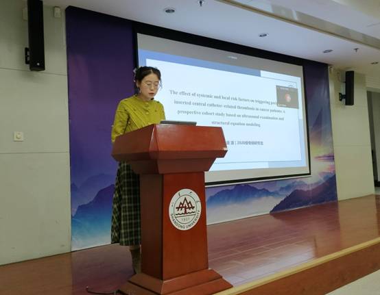 第四位汇报者是2020级硕士研究生盛源,本次汇报的是发表在International Journal of Nursing Studies杂志上的一篇文章。该杂志五年影响因素是6.847,文章的题目是《The effect of systemic and local risk factors on triggering peripherally inserted central catheter–related thrombosis in cancer patients: A prospective cohort study based on ultrasound examination and structural equation modeling》。PICC相关性血栓(PICC CRT)被认为是最严重的并发症之一,虽然既往研究已经充分探讨了PICCRT的危险因素,这些危险因素可以分为系统性危险因素如高凝状态、高龄、肥胖等,以及与PICC技术相关的局部性危险因素如血流速度、导管-静脉直径比值(CVR)、穿刺次数等,但上述两类危险因素引发PICCRT的作用效应目前尚无定论。因此本研究的目的是探讨全身及局部危险因素对PICCCRT形成的影响及相互关系,有助于采取有效措施降低血栓的发生。该研究对2019年5月至2020年7月在四川大学华西医院接受PICC置管的癌症患者进行了一项前瞻性队列研究。由同一名超声医师在置管前1天及置管后2周内每隔1天采用超声评估患者是否发生PICCRT,同时,由指定的研究护士收集患者的年龄、BMI、出凝血指标、血流速度、CVR以及穿刺次数等数据。结果显示:在纳入的173例患者中,126例(72.8%)患者被诊断为导管相关性血栓,大部分PICCRT (n = 118, 93.7%) 在置管后5天内确诊,所有的PICCRT都在置管后9天内确诊。结构方程模型结果显示:局部性危险因素(CVR标准化路径系数=0.32、p<0.05),血流速度标准化路径系数=−0.35、p<0.05)引发PICCRT的作用效应大于系统性危险因素(年龄标准化路径系数=0.13、p<0.05,高凝状态标准化路径系数=0.17,p<0.05)。这提示PICC置入后第一周是预防PICCRT的关键时期,应针对局部危险因素制定综合干预方案实施血栓防控。