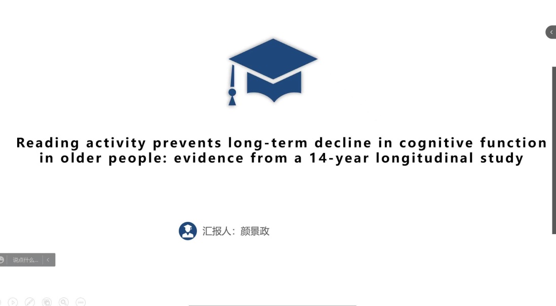 第四位汇报者是2020级硕士颜景政,汇报的文章为“Reading activity prevents long-term decline in cognitive function in older people: evidence from a 14-year longitudinal study”,该篇文章2022年发表于INTERNATIONAL PSYCHOGERIATRICS杂志上。这项研究探讨了日常生活中的阅读活动对认知能力下降风险的影响,以及这种影响是否因教育水平而不同。本研究是一项 6 年、10 年和 14 年随访的纵向研究,在家中使用结构化问卷进行面对面访谈。对1,962名64岁及以上的台湾社区居住的老年人进行了代表性的抽样调查,在14年内进行了4次随访调查。基线阅读频率是根据休闲活动的量表来测量的。简易心智状态问卷调查表用来测量认知表现。逻辑回归用来评估基线阅读和后来认知能力下降之间的关联。阅读和教育之间的交互项是为了比较不同教育水平下阅读对认知能力下降的影响。调整协变量后,那些阅读频率较高(每周≥1次)的人在6年,10年,14年出现认知下降的可能性较低。在 14 年的随访中,观察到在所有教育水平下观察到阅读频率较高的老年人与阅读频率较低的老年人相比,认知能力下降的风险降低。总之,目前的研究提出的证据表明,更多的参与阅读活动可以独立预测晚年认知能力下降的风险。此外,在所有的教育水平上都可以观察到长期的有利影响;低教育水平可能不会阻碍阅读活动对老年人认知功能的有利影响。促进阅读活动是在社区环境中改善认知健康的一个有希望的方法。