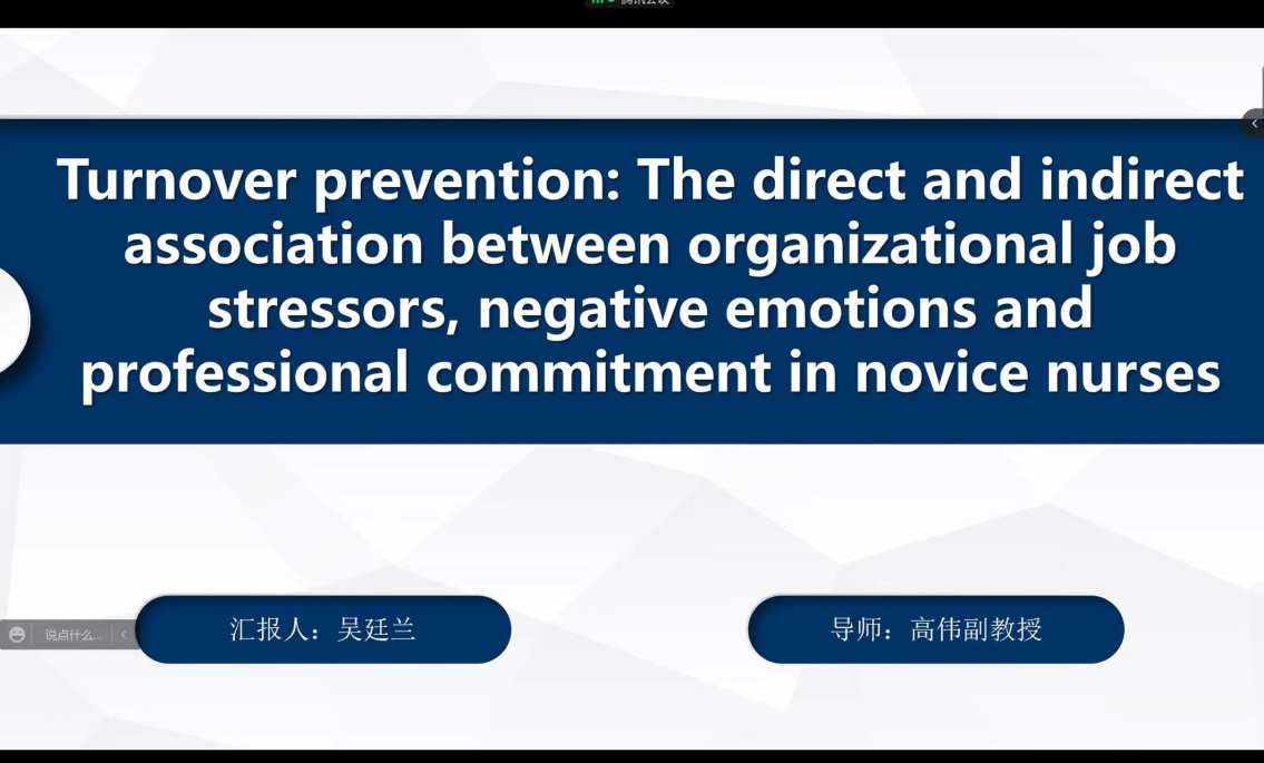 第二位汇报者是2020级硕士吴廷兰,汇报的文章为“Turnover prevention: The direct and indirect association between organizational job stressors, negative emotions and professional commitment in novice nurses”,该篇文章2019年发表于Journal of advanced nursing杂志上。研究表明,与人员充足的医院相比,人员不足医院的死亡风险高出6%;更多的床旁护士可以提高护理服务质量,减少感染和患者死亡率。职业承诺水平低是导致护士离职的风险因素之一。职业承诺与工作需求-资源和情绪衰竭有关,即负性情绪,如对工作不满意,可能会降低职业承诺,增加离职风险。积极的工作环境可能降低离职率,而组织工作压力源与组织环境相关,如高工作负荷、护理复杂性等有关,也与人际关系因素有关,如工作与生活干扰和护士与其他医疗专业人员的关系。对于目前全球护士短缺的情况,重要的是调查护士和新护士的职业承诺、负性情绪和组织工作压力源之间的关系,更重要的是,找出与负性情绪和职业承诺相关的最关键的工作压力源。本研究采用观察性队列研究设计,采用方便抽样。数据来自于一个大型数据集,其中包含来自18名新护士的580个日记条目。结合定量和定性数据收集方法来评估研究变量。通过Q在线软件收集了2013年9月至2014年9月的电子日记和问卷数据。本研究,用SPSS25.0 软件进行描述性分析,为了更深入的了解组织工作压力源对职业承诺的直接和间接路径,使用MPlus7.11进行路径分析。采用稳健标准误差多元线性回归的最大似然法处理非正态性和缺失值。我们计算了偏差校正bootstrapped置信区间验证间接路径。 研究结果显示,除了工作需求冲突外,所有变量的间接路径都是显著的。工作需求冲突与职业承诺呈直接负相关,与负性情绪呈直接正相关。我们发现,缺乏同事支持、患者的负面体验、护理的复杂性、生存事件、缺乏控制、和工作与生活的平衡等组织工作压力源均通过消极情绪对职业承诺产生间接负性关系。护士需要一个支持性的工作环境来应对最关键的组织工作压力,以增强职业承诺。