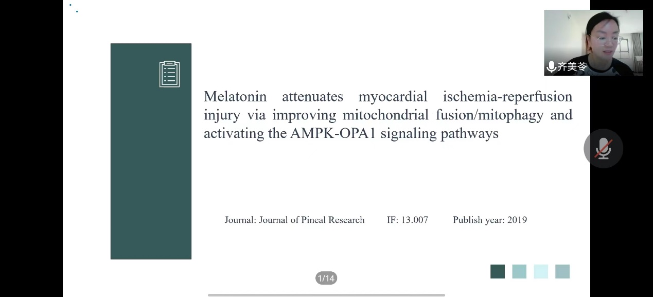 第二位汇报人路广平,汇报的文献题为“Melatonin attenuates myocardial ischemia-reperfusion injury via improving mitochondrial fusion/mitophagy and activating the AMPK‐OPA1 signaling pathways”,该文献从心肌缺血再灌注损伤出发,重点讲述了褪黑激素通过AMPK信号通路影响OPA1的稳定机制,说明褪黑激素调控AMPK-OPA1-线粒体融合/线粒体自噬轴可能是减少心脏缺血再灌注损伤的一种新的治疗方法,具有重要临床意义。