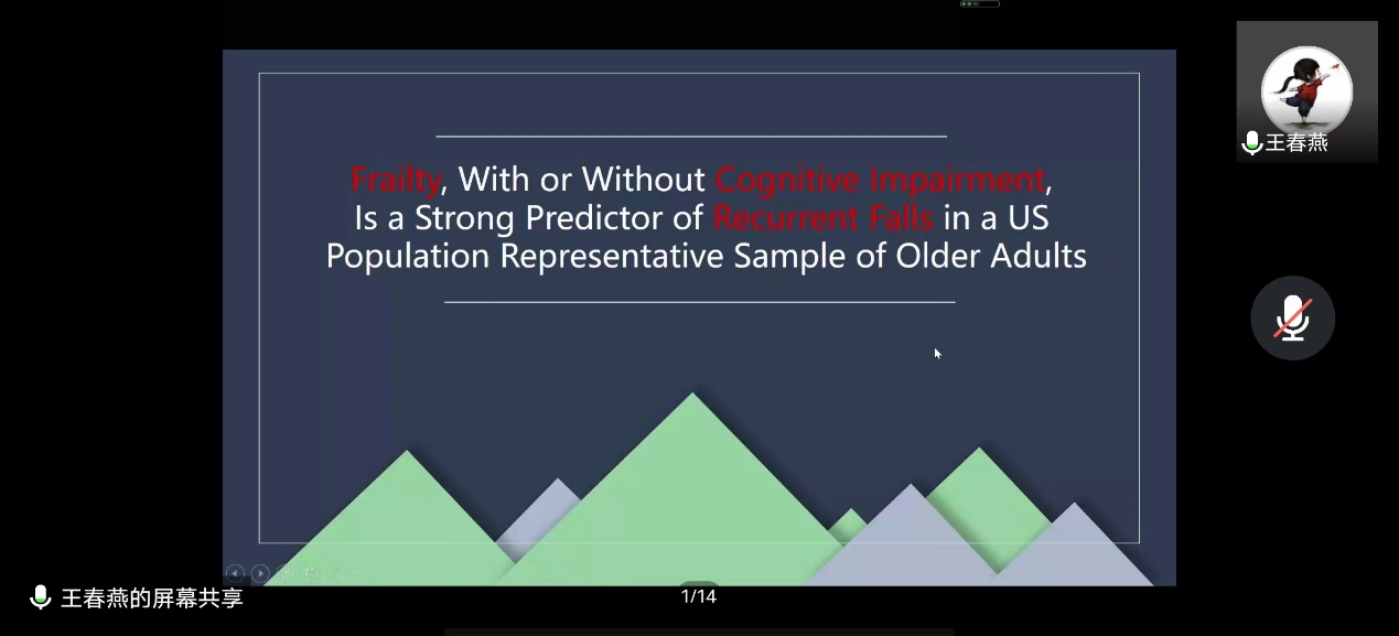 第四位汇报者是2020级博士研究生王春燕,汇报的是2021年发表在Journals of Gerontology: Medical Sciences上的文章“Frailty, With or Without Cognitive Impairment, Is a Strong Predictor of Recurrent Falls in a US Population Representative Sample of Older Adults”,该文章是由中国的华西医院的葛美玲老师使用美国NHATS老年人大数据进行的一项纵向研究。文章设计巧妙,思路清晰。从横断面和纵向层面分析了衰弱和认知功能障碍对跌倒发生的影响。其结果显示,衰弱无论伴或不伴认知功能障碍都是是跌倒的重要危险因素,仅有认知功能障碍对跌倒的影响较微弱。跌倒对老年人的健康有重要影响,该文章进一步丰富了跌倒发生危险因素的研究证据。