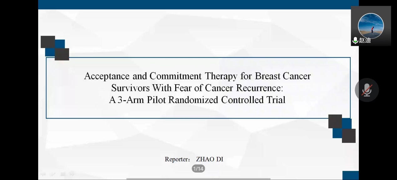 第三位汇报者赵迪汇报的是发表在Cancer杂志上的一篇文章,该杂志2020年影响因子是6.86。她汇报的文章题目是Acceptance and Commitment Therapy for Breast Cancer Survivors With Fear of Cancer Recurrence: A 3-Arm Pilot Randomized Controlled Trial,该文章是一个试点研究,探讨了接纳承诺疗法(ACT)、生存教育(SE)和强化常规护理(EUC)对乳腺癌幸存者的癌症复发恐惧(FCR)的干预效果和可行性。本研究采用的是随机对照的设计,选取治疗后伴有FCR的91例乳腺癌患者(临床诊断为I-III期),将其随机分为ACT组(6周,2小时/次),SE组(6周,2小时/次)和EUC组(6周,30分钟/次)。在基线(T1)、干预后即刻(T2)、干预后1个月(T3)、干预后6个月(T4)分别评估了FCR严重程度(主要结局变量),回避性应对、焦虑、创伤后应激障碍、抑郁、生活质量和其他FCR相关变量(次要结局变量)。采用意向性分析对数据进行处理,采用一般线性模型(GLM)分析每个时间点与基线对比的效果,同时进行组内和组间的比较。结果显示,招募率(43.8%)和参与率(94.5%)都比较高,说明具有一定的可行性。三组结果显示,随着时间的推移,FCR的严重程度在组内均降低,但只有ACT组在每个时间点与基线相比呈现显著降低;与SE和EUC相比, ACT组在T4时间点的组间差异也支持了其显著的效果 (Cohen d分别为,0.80和0.61)。对探讨的12个次要结局指标中,ACT有10个指标在所有时间点均有显著效果。在T4时间点,ACT在回避性应对、焦虑、抑郁、生活质量和FCR相关的心理困扰方面,优于SE和EUC。本研究表明,基于团体的ACT是一种可行且有前途的治疗FCR的方法。齐美苓老师就本研究样本量的计算提出了问题,同时分享了样本量选择的相关文献,这对于指导我们进行试点研究具有很大的帮助。