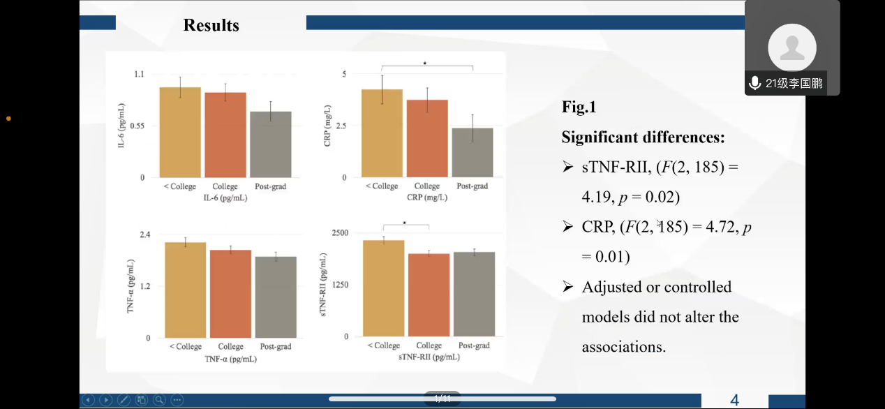 第二位汇报者是2021级博士研究生李国鹏,他为大家带来的文献题目是“Socioeconomic Status and Inflammation in Women with Early-stage Breast Cancer: Mediation by Body Mass Index”,这篇文章于2022年1月发表于Brain Behavior and Immunity。社会经济地位(SES)较低的乳腺癌女性常表现出明显更差的结果,这可能与SES影响炎症有关,尽管在患有乳腺癌的女性中还没有研究过上述SES与炎症标志物的关系。本研究的研究目的是在早期乳腺癌女性患者中验证:1)SES与炎症标志物的关系;2)BMI在上述关系中的中介作用。方法:横断面研究设计,纳入诊断和病理(0-IIIA)早期的乳腺癌的女性(N = 194),采用问卷调查和血标本收集评估参与者SES、BMI和炎症标志物:IL-6、CRP、TNF-α和sTNF-RII。一般线性模型检验SES和炎症标志物之间的联系,Process中介模型检验BMI的中介作用。结果:受教育程度与CRP相关(F(2185) = 4.72, p = 0.001),与sTNF-RII相关(F(2185) = 4.19, p = 0.02);。此外,BMI还中介了受教育程度与CRP (95% CIs [-0.62, -0.11; -0.76, -0.21]), sTNF-RII (95% CIs [-0.09, -0.01; -0.10, -0.02]),和IL-6 (95% CIs [-0.32, -0.05; -0.38, -0.09])之间的关系;家庭年收入与炎症关系不显著,通过BMI对炎症的间接影响不显著。结论:在本研究样本中,较低的教育水平与较高的炎症水平相关,这可能预示着较差的乳腺癌相关和临床结果;针对乳腺癌BMI和炎症的干预措施的发展应该考虑社会经济地位的影响。
