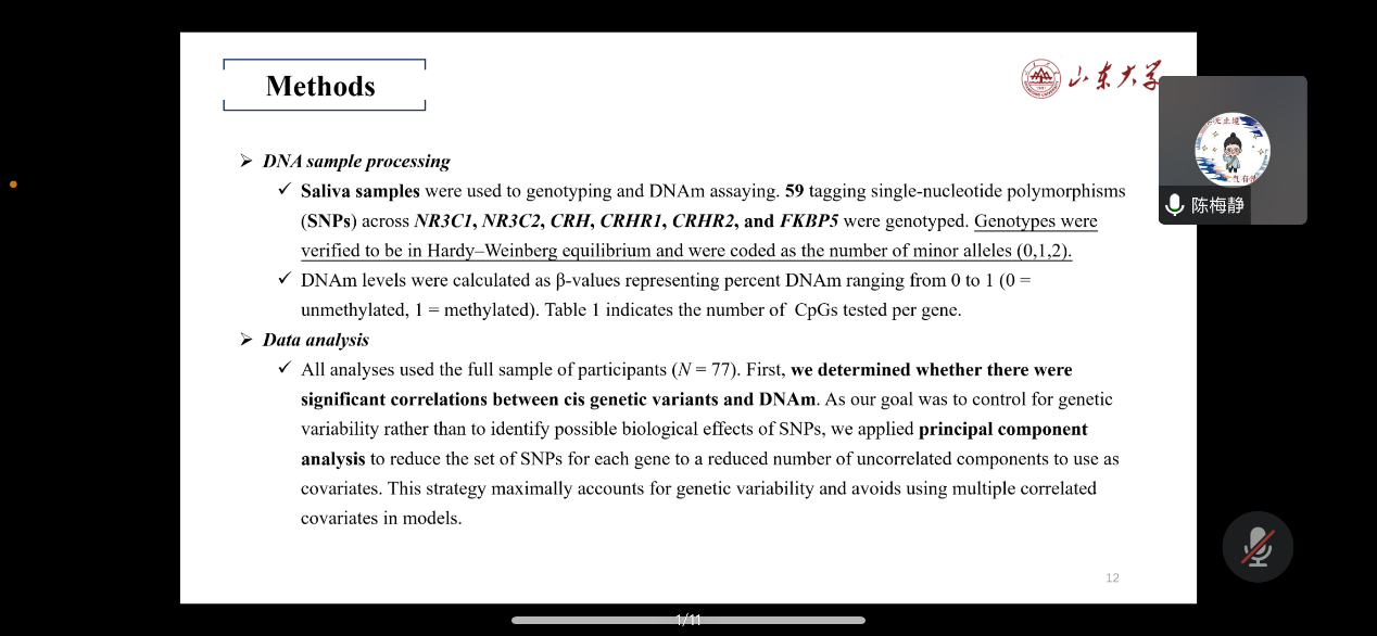 本次论坛第四位汇报者是2021级学术型研究生陈梅静,她为大家带来的文献题目是“DNA methylation of HPA-axis genes and the onset of major depressive disorder in adolescent girls: a prospective analysis”,这篇文章于2019年发表于Translational Psychiatry。与HPA轴功能相关的基因的甲基化可能是环境暴露对应激反应系统生物学影响的一个重要标志。本研究的研究目的是在青春期女孩中检验:1)HPA轴基因的DNA甲基化能否显著预测重度抑郁障碍(MDD)的发生;2)在抑郁症的家族风险和HPA轴基因遗传变异(SNPs)之外,HPA轴基因的DNA甲基化能否继续显著预测MDD的发生。方法:纵向研究设计,纳入在提供唾液样本进行DNA甲基化测序时没有当前或过去诊断的MDD的青春期女孩(N = 77),分为抑郁症高家族风险组(N = 37)和抑郁症低家族风险组(N = 40),采用问卷调查、结构化访谈、基因分型和DNA甲基化测序技术评估参与者在随访期间MDD的首次发作情况、基线时HPA轴基因常见的遗传变异和DNA甲基化水平。Cox比例风险回归模型检验基线时的DNA甲基化水平和MDD首次发作之间的联系。结果:各基因内的SNPs和CpGs具有一定相关性;抑郁症高家族风险的女孩比低家族风险的女孩发展为MDD的比例更高,但抑郁症高家族风险的女孩和低家族风险的女孩发展为MDD时的平均年龄没有显著差异;未控制HPA轴基因的遗传变异时,HPA轴NR3C1、CRH、CRHR1和CRHR2基因的7个CpG位点可显著预测MDD的发生;控制HPA轴基因的遗传变异后,上述位点仍然显著,并发现额外3个显著的CpG位点;在这10个位点和p = 0.2的阈值上,MDD组仅CRHR1基因cg07508782位点的甲基化水平显著高于对照组,其他基因的其他位点的甲基化水平均显著低于对照组。结论:在本研究样本中,在HPA轴遗传变异和抑郁症的家族风险之外,HPA轴基因的DNA甲基化水平的变化可以前瞻性地预测MDD的发生,针对MDD的干预和预防措施的发展应该考虑表观遗传因素的影响。