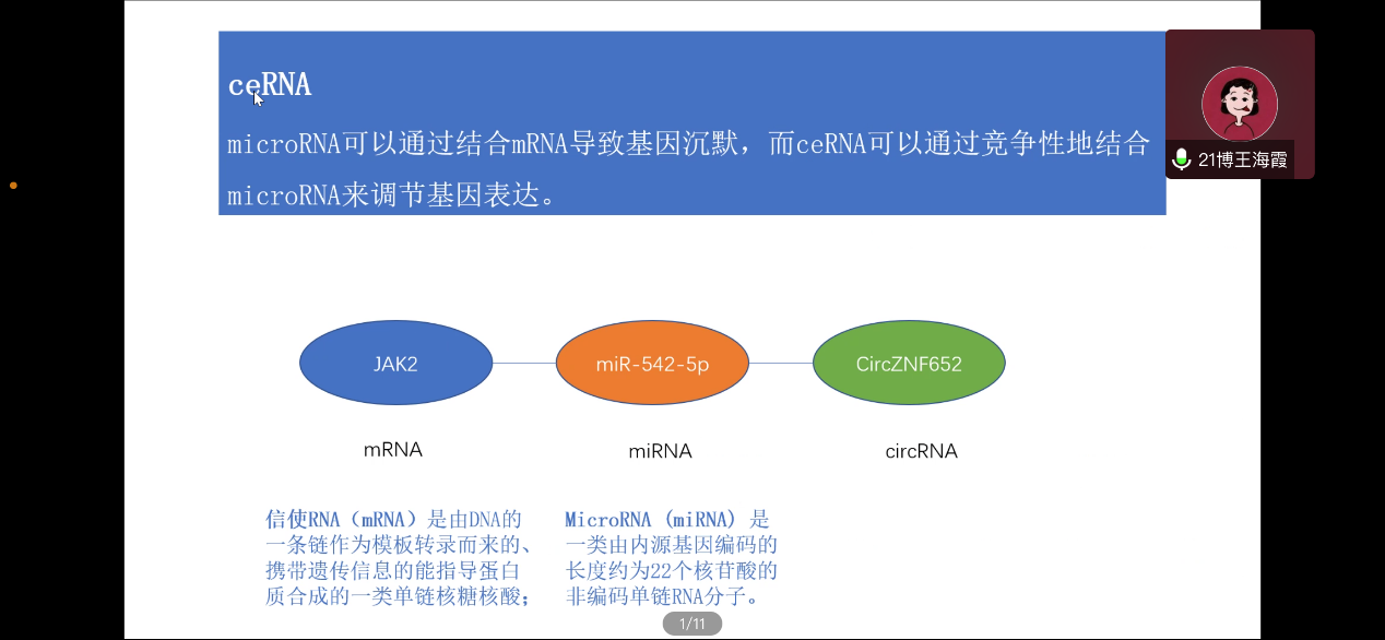 第三位汇报者是2021级博士研究生王海霞,汇报的文献题目是“CircZNF652 promotes the goblet cell metaplasia by targeting the miR-452-5p/JAK2 signaling pathway in allergic airway epithelia”。本研究探讨了circZNF652在过敏性气道上皮重塑调节中的潜在作用和机制。我们采用转录组微阵列分析了CircRNA的差异表达谱,并通过PCR、RNA-FISH、蛋白质印迹、RNA pulldown和RNA免疫沉淀分析,研究了circNF652介导的杯状细胞化生的影响和机制。在过敏性气道炎症小鼠模型和哮喘患儿模型中,探讨了circZNF652和miR-452-5p在过敏性气道上皮重塑中的作用。本研究发现circZNF652通过充当miR-452-5p的海绵来促进杯状细胞化生,其释放JAK2表达,随后激活JAK2 / STAT6信号传导。此外,ESRP1通过与其侧翼内含子结合来加速circZNF652的生物发生,以促进过敏性气道上皮重塑中的杯状细胞化生。因此,过敏性支气管上皮中circZNF652表达的上调通过激活miR-452-5p/JAK2/STAT6信号通路而导致杯状细胞化生,这为过敏性气道炎症中上皮重塑的治疗干预提供了另一种方法。
