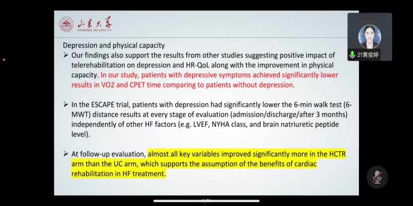 第一位汇报者是2021级博士研究生黄俊婷,汇报的文章为来自于European Journal of Cardiovascular Nursing上“Relationship between physical capacity and depression in heart failure patients undergoing hybrid comprehensive telerehabilitation vs. usual care: subanalysis from the TELEREH-HF Randomized Clinical Trial”。TELEREH-HF试验亚分析的主要和新颖的发现是运动能力试验和HF-QoL 的改善因患者的心理状态而异。在我们的研究中,在 9 周的干预/观察期间,HCTR 组和 UC 组的抑郁症状平均水平均有所下降。与其他研究相反,我们的发现表明,参与研究本身可能对患者的情绪状态有益。尽管体能、发病率和死亡率通常是评估心力衰竭心脏康复影响的研究的主要终点,但 HCTR 对心理社会变量(如抑郁)的影响也应考虑在内。因此,重要的是,心脏护士配备适当的工具,以识别抑郁症的症状。护士对抑郁症筛查和转诊的信心水平可以通过有针对性的教育举措来提高。但是,本文的分析仅限于 9 周的干预/观察期。它不允许对 HCTR 对心衰进程的影响作出长期结论。此外,需要强调的是,大多数 TELEREH-HF人口是男性(89%),因此,结果不能完全外推至女性人口。
