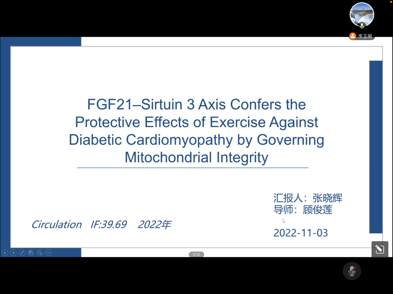 第三位汇报者是2021级硕士研究生张晓辉,汇报的文章来自于Circulation,题为“FGF21–Sirtuin 3 Axis Confers the Protective Effects of Exercise Against Diabetic Cardiomyopathy by Governing Mitochondrial Integrity”,该文献从运动引起血清中FGF21水平下调和小鼠心脏组织中KLB上调出发,重点讲述了运动能够增加糖尿病小鼠心脏组织中KLB的敏感性进而通过FGF21及其下游信号级联反应来改善糖尿病引起的心肌线粒体损伤。
