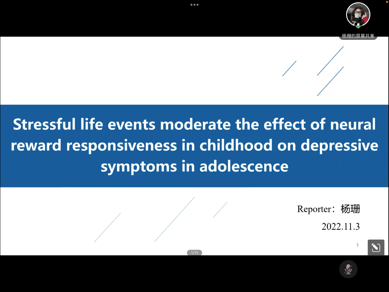第二位汇报者是2021级硕士研究生杨珊,汇报的文章来自于Psychological Medicine期刊,题为“Stressful life events moderate the effect of neural reward responsiveness in childhood on depressive symptoms in adolescence”。本研究为横跨3年的纵向研究设计,使用事件相关电位技术探索压力性生活事件与奖赏敏感性(RewP)对青少年抑郁的交互作用从儿童期晚期至青春期早期。研究结果表明,在RewP较低个体中,经历更多的压力性生活事件将增加青少年患抑郁的风险,特别是针对更多的独立性生活事件。同时,本研究还检验了gain和loss与压力的交互作用是否显著,结果显示gain和更高的总压力及独立性生活事件交互作用明显,而loss无统计学效应。本研究存在一些问题:首先本研究使用的是金钱奖赏,对于使用其他实验范式可能会具有更强的效应。另外,因12岁抑郁的发病率较低所以本研究使用的是抑郁症状而非抑郁诊断。