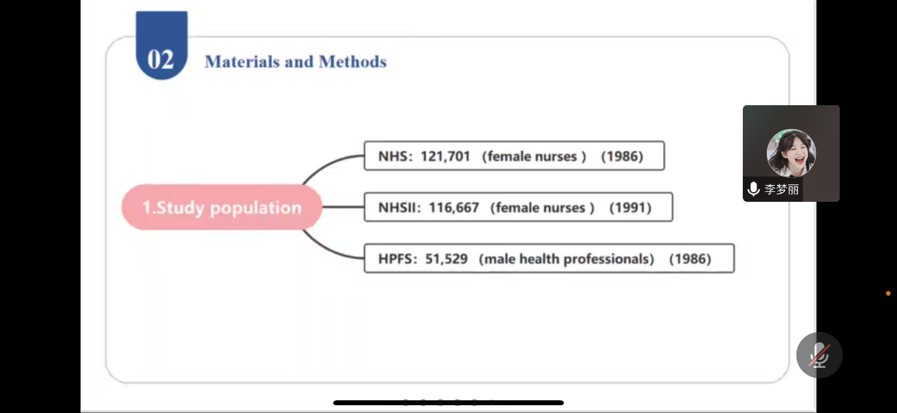 第二位汇报者是2021级硕士研究生李梦丽,汇报的文章题为《Alcohol consumption and risk of inflammatory bowel disease(IBD) among three prospective US cohorts》。该研究基于目前关于酒精剂量、克罗恩病(CD)和溃疡性结肠炎(UC)的类型和风险的数据有限的现状,通过检索护士健康研究、护士健康研究II和卫生专业随访研究这三大数据库,全面探究饮酒与克罗恩病(CD)和溃疡性结肠炎(UC)风险之间的关系。文献中严格的质量控制和创新的数据统计方法——用限制性立方样条曲线评估饮酒量与克罗恩病(CD)和溃疡性结肠炎(UC)风险之间的非线性关联特别值得我们学习。