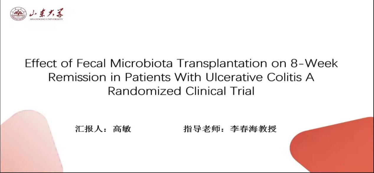 第一位汇报者是2021级硕士研究生高敏,汇报的文章来自JAMA期刊,题为“Effect of Fecal Microbiota Transplantation on 8-Week Remission in Patients With Ulcerative Colitis A Randomized Clinical Trial”。该研究在澳大利亚进行,研究对象在澳大利亚的两个IBD诊所进行招募。该研究按1:1的比例将受试者随机分为自体FMT(aFMT)组和捐赠者FMT(dFMT)组,并首次利用厌氧环境制备粪便悬浮液。通过3次FMT干预后,第4周和第8周的试验结果表明,相较于aFMT组,dFMT组的非类固醇缓解率更大,且梅奥评分有更大程度的下降,对于溃疡性结肠炎的改善效果更加明显。同时,微生物组分析结果表明Anaerofilum pentosovorans和Bacteroides coprophilus物种丰度的增加与溃疡性结肠炎的改善密切相关。该随机对照临床试验利用短期、低负担、混合粪便及对专性厌氧菌保留的治疗方案获得了与其他高负担治疗方案类似的临床效果,为后期开展更大规模的临床试验打下基础。