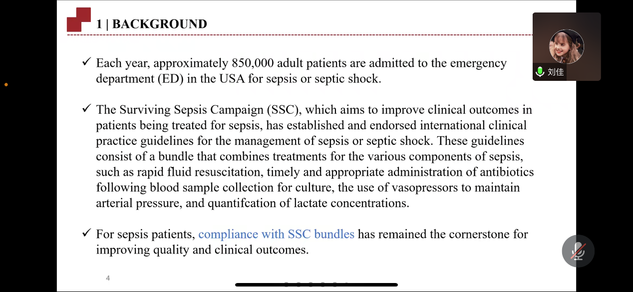 第三位汇报者是2021级硕士研究生刘佳,汇报的文章为来自CRITICAL CARE期刊,题为“Relationship between time of emergency department admission and adherence to the Surviving Sepsis Campaign bundle in patients with septic shock”。该研究探讨了急诊科脓毒性休克患者集束化治疗依从性与入院时间、住院死亡率、28天死亡率之间的关系。结果显示,与夜间入院相比,日间入院的脓毒性休克患者3小时集束化治疗依从性较低,这可能与日间入院患者人数多、患者/医务人员比值较高有关。此外,3小时集束化治疗依从性与住院死亡率、28天死亡率有关,集束化治疗依从性越高,死亡率越低。因此,该研究表明提高脓毒性休克患者日间3小时集束化治疗依从性可改善患者预后。