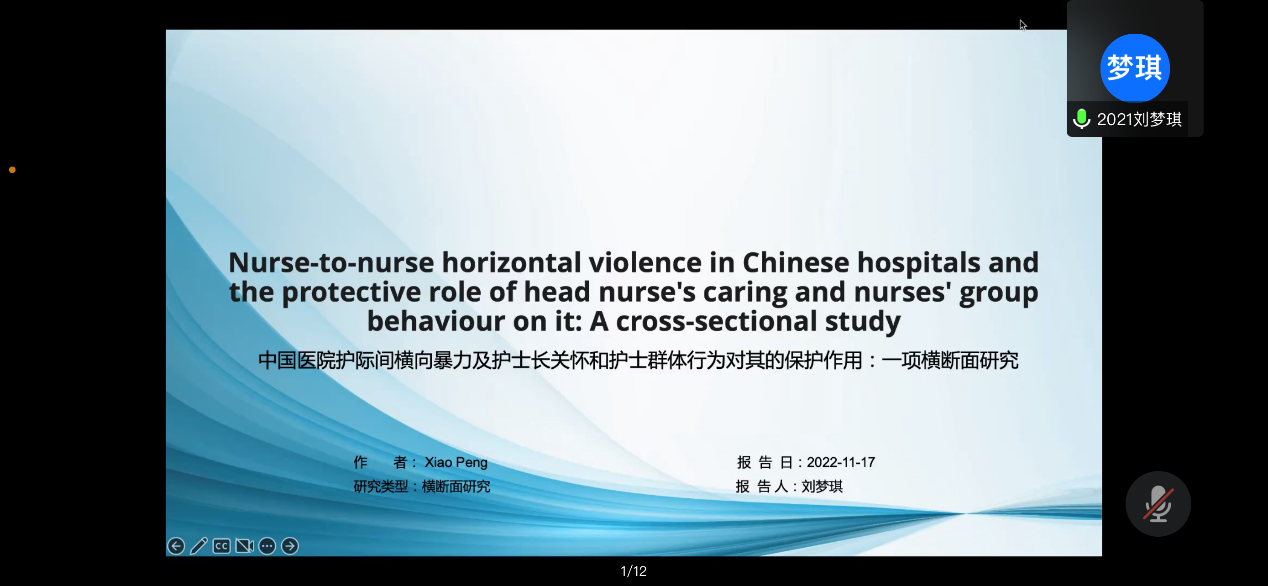 第四位汇报者是2021级硕士研究生刘梦琪,汇报的文章来自Journal of nursing management期刊,题为“Nurse-to-nurse horizontal violence in Chinese hospitals and the protective role of head nurse's caring and nurses' group behavior on it: A cross-sectional study”。该研究在中国进行,研究对象在湖北省武汉市的七家医院内进行招募。该研究旨在分析中国医院护士间横向暴力的发生率,并考察护士长的关怀和护士的群体行为对横向暴力的影响。横向暴力是影响护理职业的一个严重的全球性问题,但这一问题在中国医院的发生情况知之甚少。越来越多的证据表明领导力和团体因素在促进横向暴力方面是很重要的,而护士长的关怀和团体行为在护士眼中是否对横向暴力有保护作用仍不清楚。该研究结果表明,横向暴力在中国护士中很常见,而护士长的关怀和保持护士群体行为的良好氛围可以作为预防横向暴力的保护因素。该研究有助于护理管理者确定哪些具体的负面行为经常发生,此外,护理管理者还可以通过提高对护士的关怀能力,营造良好的团体氛围,以缓冲或防止横向暴力的发生,故具有一定的临床意义。