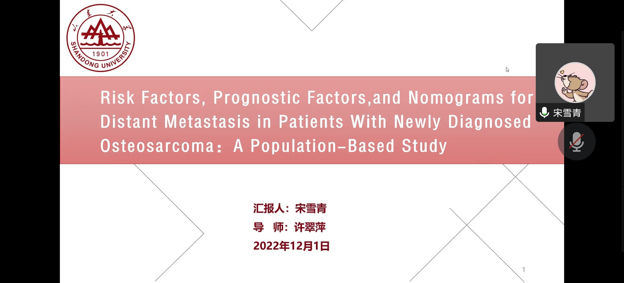 第一位汇报者是2021级硕士研究生宋雪青,汇报的文章来自Frontiers in Endocrinology 上的“Risk Factors, Prognostic Factors, and Nomograms for Distant Metastasis in Patients With Newly Diagnosed Osteosarcoma: A Population-Based Study”。该研究基于美国国立癌症研究所建立的大型肿瘤数据库SEER数据库(Surveillance,Epidemiology,and End Results)建立了骨肉瘤患者发生远处转移诊断和预后两个队列,使用单因素和多因素Logistic回归及单因素和多因素Cox回归分析探究骨肉瘤患者发生远处转移的危险因素和预后因素并构建列线图。结果表明,年龄、分级、T分期、N分期是骨肉瘤患者发生远处转移的危险因素;年龄、化疗、手术是骨肉瘤患者远处转移的预后因素;ROC 曲线、校准曲线、DCA 决策曲线和 Kaplan-Meier (K-M) 生存曲线在建模组、验证组和扩展组中的结果证实,两个列线图可以精确预测骨肉瘤患者远处转移的发生和预后。