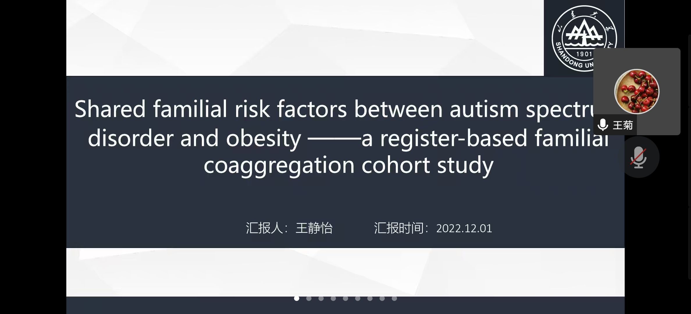 第三位汇报者是2021级硕士研究生王静怡,汇报的文章为“Shared familial risk factors between autism spectrum disorder and obesity — a register-based familial coaggregation cohort study”。自闭症谱系障碍(ASD)是一种神经发育障碍,与肥胖之间存在一定的关联。但这种关联背后的因素目前尚不清楚。并且ASD与肥胖同属于高遗传性疾病,这背后可能提示存在一定的家族风险因素。鉴于此,本研究使用了瑞典以全国为基础的人口追踪样本,调查了智力残疾(ID)、精神共病、精神药物是否可以影响ASD与肥胖之间的关联。研究结果表明,ASD与肥胖之间的关联不完全由ID驱动,但在ASD不伴有ID的组别中,存在着性别差异;在调整了性别、出生年份、父母教育水平、精神共病和精神药物后,这种关联明显减弱,但仍存在显著的统计学意义;自闭症和肥胖之间至少部分共有的家族因素(遗传和/或共有的环境因素)是由于遗传因素。这提示临床上无论ASD患者的ID状态如何,都应进行肥胖筛查,并且应进一步研究ASD与肥胖之间的神经生物学与行为学机制。
