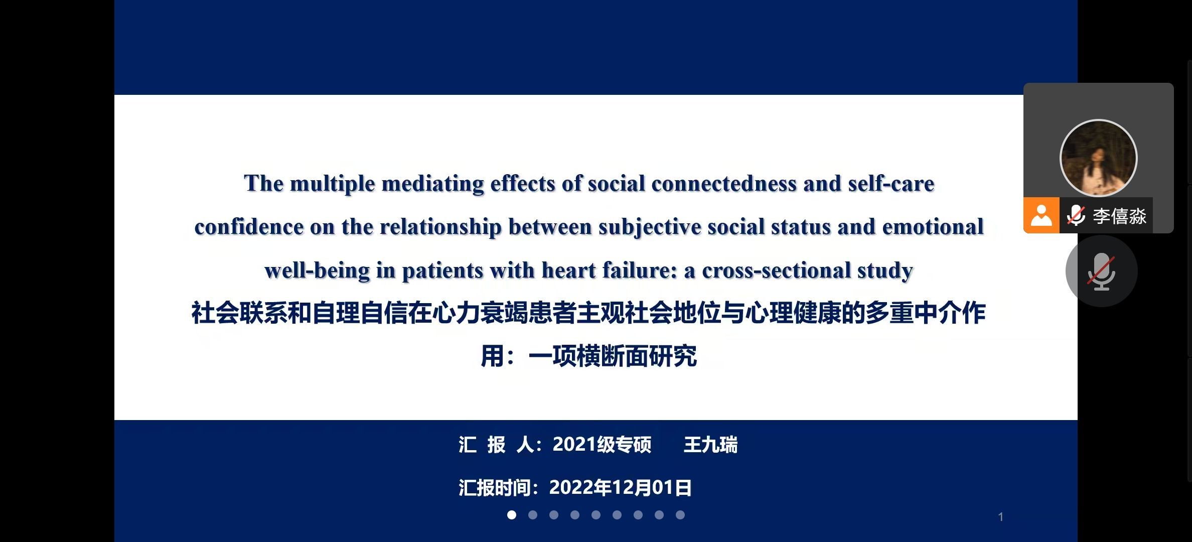 第四位汇报者是2021级硕士研究生王九瑞,汇报的文章来自于European Journal of Cardiovascular Nursing上的 “The multiple mediating effects of social connectedness and self-care confidence on the relationship between subjective social status and emotional well-being in patients with heart failure: a cross-sectional study”。这篇文章采用横断面研究设计,以储备能力模型为理论基础,探讨社会联系和自理自信在心力衰竭患者主观社会地位与心理健康的多重中介作用。本研究首先所纳入心力衰竭患者的社会人口学和临床资料及相关变量进行了统计描述;其次采用Pearson相关分析探索主观社会地位、社会联系、自理信心和心理健康之间的关系;再通过多元线性回归分析构建了3个模型来验证在控制了协变量后主观社会地位、社会联系、自理信心对心理健康的作用;最后利用SPSS 中的PROCESS插件验证中介关系。研究结果表明社会联系在心力衰竭患者主观社会地位和心理健康之间起中介作用,自理信心在主观社会地位和心理健康间也起中介作用,同时主观社会地位可以通过社会联系影响自理信心进而影响患者的心理健康。