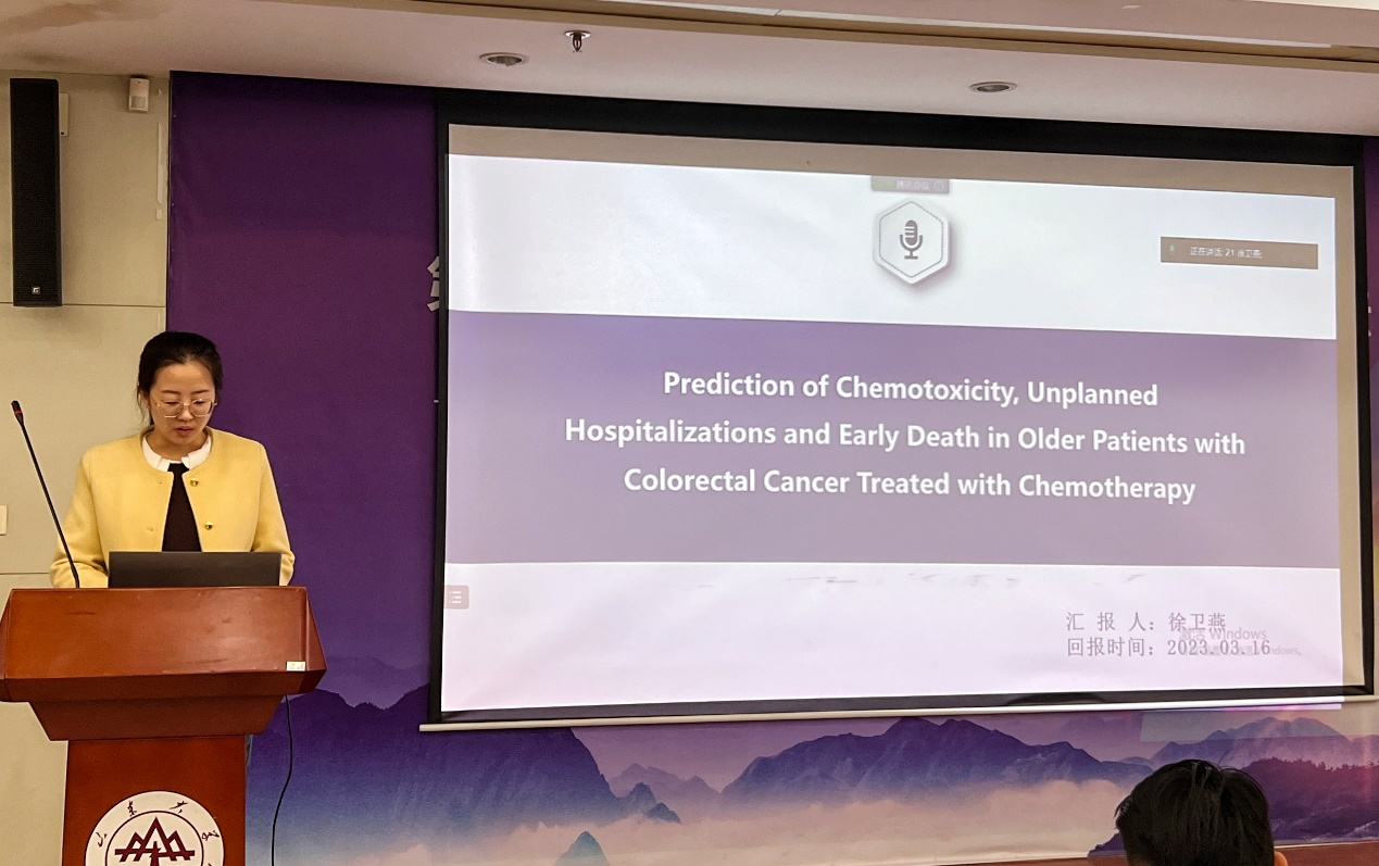 第三位汇报者是2021级硕士研究生徐卫燕,汇报的文章来自CANCERS杂志,题目为“Prediction of Chemotoxicity, Unplanned Hospitalizations and Early Death in Older Patients with Colorectal Cancer Treated with Chemotherapy”。该研究前瞻性地纳入了多中心的215例70岁以上接受化疗的结直肠癌患者,在化疗前进行评估并收集肿瘤学和实验室指标。采用多变量逻辑回归检验这些变量与3-5级化疗毒性反应、非计划住院和早期死亡(6个月内发生的死亡)之间的关系,并对这些变量开发了预测评分,使用该评分可以可靠地预测有严重化疗毒性反应、非计划住院、早期死亡风险的患者,从而有助于制定化疗策略、实施干预措施、优化医疗和社会资源。