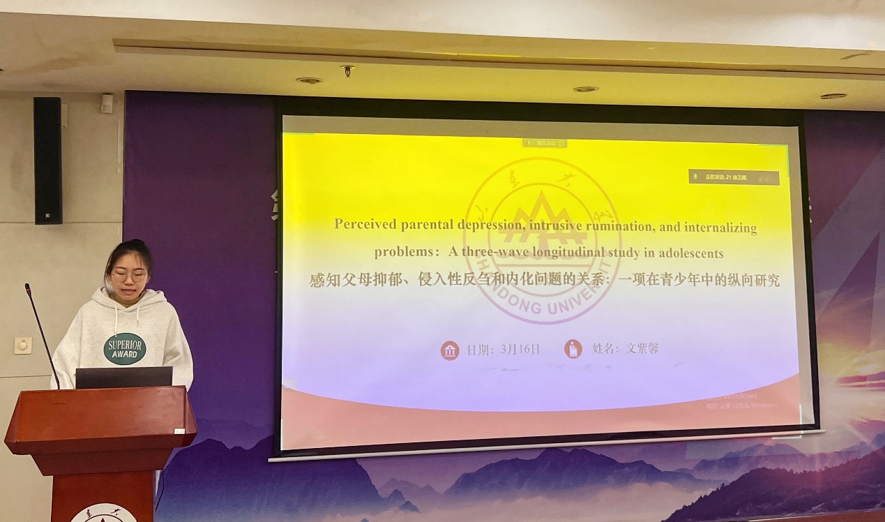 第一位汇报者是2021级硕士研究生文紫馨,汇报文章的题目为“Perceived parental depression, intrusive rumination, and internalizing problems: A three-wave longitudinal study in adolescents”。有研究表明,感知父母抑郁会引发青少年的内化问题,但也有研究发现,青少年的内化问题会增加他们对父母情绪的感知。为进一步探讨两者的关系,该研究使用纵向数据来检验青少年的内化问题与他们所感知到的父母抑郁之间的因果关系,以及侵入性反刍在这种关系中的作用。该研究对392名经历过2017年九寨沟特大地震的青少年在震后12个月(T1)、21个月(T2)和27个月(T3)三个时间点进行调查。采用交叉滞后模型进行数据分析,发现侵入性反刍与父母抑郁和内化问题之间存在互为因果的关系,内化问题对父母抑郁有正向预测的单边因果关系。因此,针对青少年的创伤后心理干预应该侧重于解决内化问题和缓解侵入性反刍。