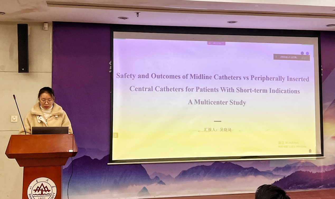 第二位汇报者是2021级硕士研究生吴晓琦,汇报的文章来自JAMA INTERNAL MEDICINE 期刊,题目为“Safety and Outcomes of Midline Catheters vs Peripherally Inserted Central Catheters for Patients With Short-term Indications A Multicenter Study”。该研究比较了从2017年12月至2020年1月在多家医院符合因静脉通路穿刺困难或静脉抗生素治疗≤30天的适应证而接受了PICC或中线置入的患者其并发症的发生情况。结果显示,在调整了混杂因素后,接受PICC的患者发生主要并发症的风险高于接受中线置入的患者。与PICC相比,中线导管并发症的减少源于较低的堵管率和血流感染率,PICC与中线导管之间深静脉血栓发生风险的差异无统计学意义。