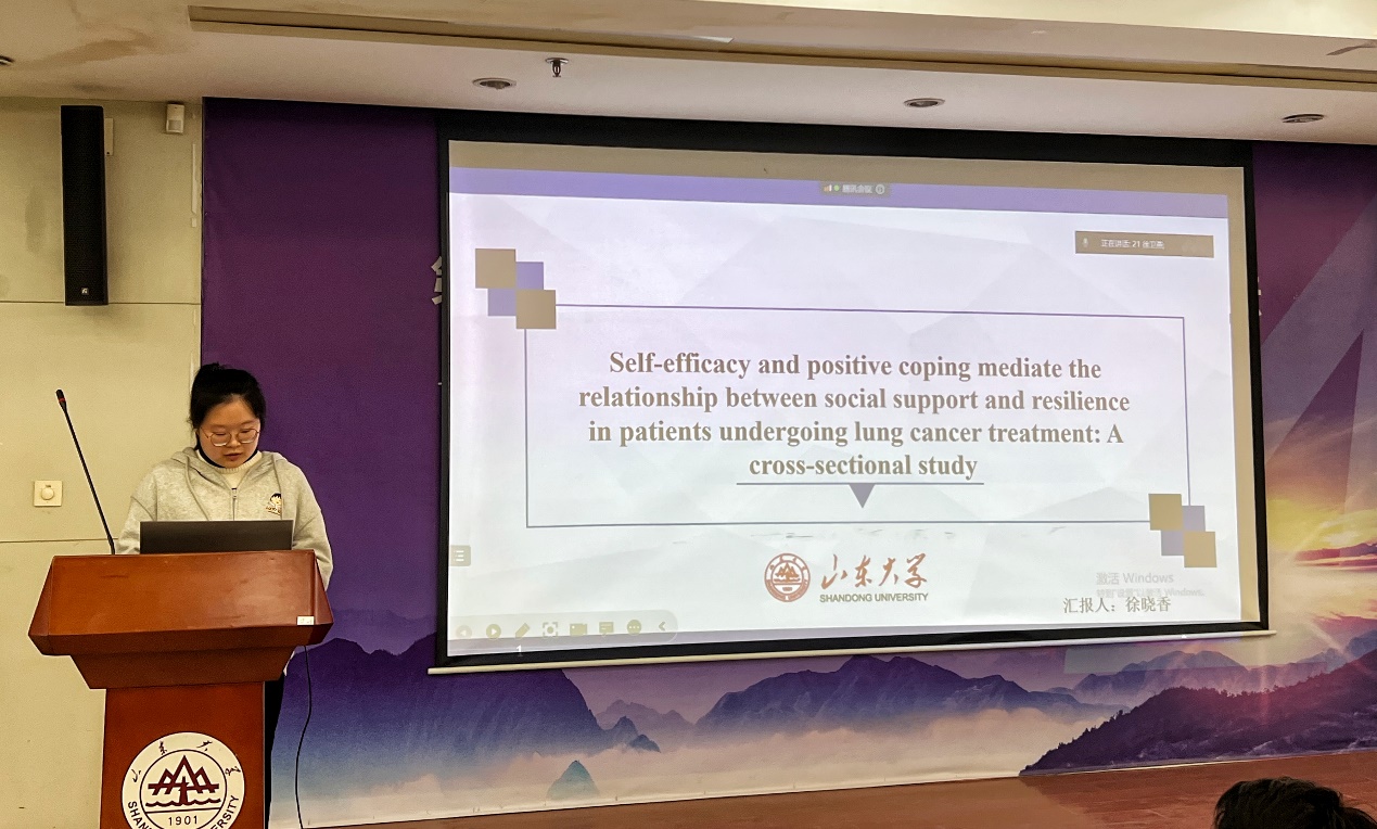 第四位汇报者是2021级硕士研究生徐晓香,汇报的文章题目为 “Self-efficacy and positive coping mediate the relationship between social support and resilience in patients undergoing lung cancer treatment: A cross-sectional study”。有研究表明,社会支持、自我效能和积极应对是心理弹性的重要预测因素。也有研究表明:社会支持可以通过言语激励等形式来增强自我效能;较高的自我效能可以强化个体采取积极的应对策略;社会支持与应对策略相关。但并未有研究探讨这四者之间的内在机制,基于此,该研究在2016至2017年便利抽取320例肺癌患者进行横断面调查。结果发现,自我效能和积极应对在患者社会支持与心理弹性之间起链式中介作用,因此,在对肺癌患者进行心理弹性干预时要考虑这些发现。另外,研究发现社会支持对积极应对的作用路径并不显著,故社会支持对癌症患者应对策略的影响机制有待进一步的研究。