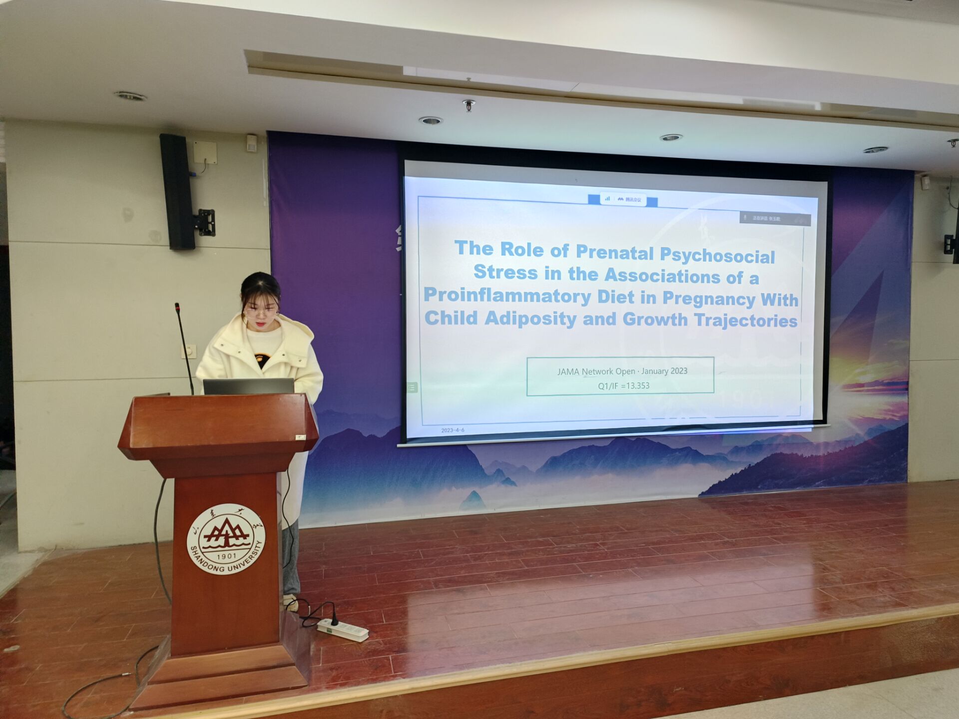 第一位汇报者是2021级硕士研究生张新涵,汇报的文章来自于JAMA Network Open,题为The Role of Prenatal Psychosocial Stress in the Associations of a Proinflammatory Diet in Pregnancy With Child Adiposity and Growth Trajectories。该文章是一项队列研究。产前心理社会压力和营养都可能导致后代肥胖,这是心脏代谢健康的重要预测因素。虽然发现压力增加和营养不良在怀孕期间同时发生,但对它们在后代中的联合纵向关联知之甚少。这项队列研究的结果表明,同时评估妇女的产前饮食和心理社会压力作为预防儿童过度肥胖的干预目标可能是有用的。在子宫内存在的社会心理压力的情况下,暴露于不良产前饮食质量和高炎症潜力的儿童可能会持续到青春期。