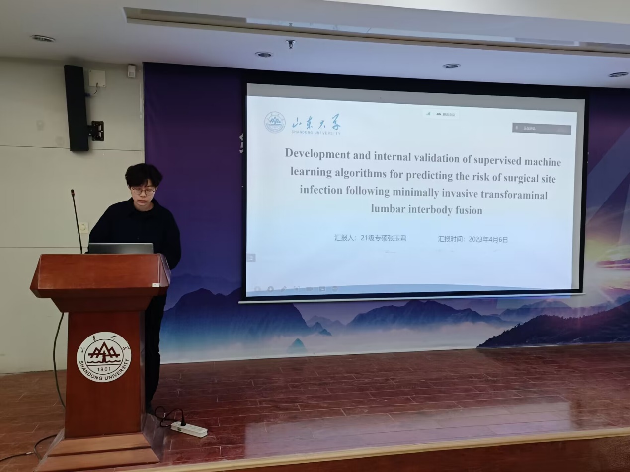 第三位汇报者是2021级硕士研究生张玉君,本次汇报文章题目为“Development and internal validation of supervised machine learning algorithms for predicting the risk of surgical site infection following minimally invasive transforaminal lumbar interbody fusion”,该文发表于Frontiers in medicine杂志。本研究通过对2012年5月至2019年10月于台州市中心医院收治的705名腰椎疾病患者的临床资料进行回顾性分析,基于机器学习算法构建并验证微创经椎间孔腰椎椎体间融合术后手术部位感染的风险预测模型。研究结果显示,患者术后SSI的发生率为4.78%,通过比较KNN、DT、SVM、RF、MLP、NB六种机器学习算法的预测效能,最终选取NB作为风险预测模型。对模型进行实例化,结果显示前六位的关联因素为术前糖化血红蛋白、估计失血量、手术时间、术前白蛋白、BMI和年龄,提示临床医护人员应对相关的危险因素采取干预措施,从而尽可能降低手术部位感染的发生风险。