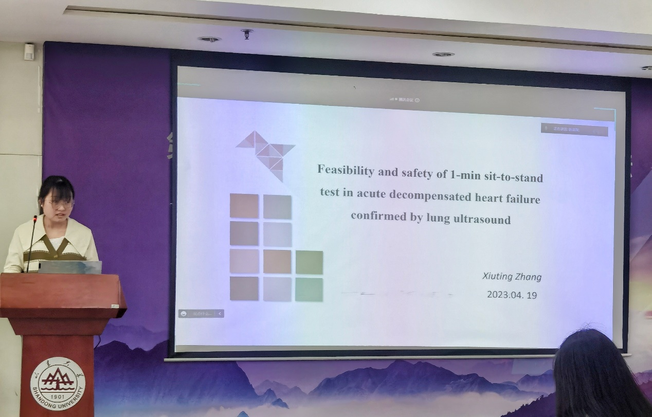 第三位汇报者是2021级博士研究生张秀婷,汇报的文章题目是“Feasibility and safety of 1-min sit-to-stand test in acute decompensated heart failure confirmed by lung ultrasound”。该研究提出可将1分钟坐立试验作为急性失代偿性心力衰竭患者功能能力的评估方法,并进一步检验了其在该类患者中的可行性和安全性。该研究是一项前瞻性、单中心的队列研究,在入院48 h内指导患者进行1分钟坐立试验,收集患者的生命体征(血压、心率、血氧饱和度等)、Borg评分(呼吸困难程度),并在试验前后采用肺超声b线测量患者的肺水肿程度。最终共有75名患者参与了该测试,共有95%的患者完成了1分钟坐立试验,平均重复次数为18±7次。在试验过程中和结束后均未发生不良事件,虽然试验后患者的血压、心率、呼吸困难程度均有升高,血氧饱和度略有降低,但整体的肺水肿程度无明显变化,b线绝对值数量也有所减少。这表明在急性失代偿性心力衰竭早期应用1分钟坐立试验是安全且可行的,既不会引起不良事件,也不会增加肺水肿的程度,可以作为一种新的功能能力评估工具使用。