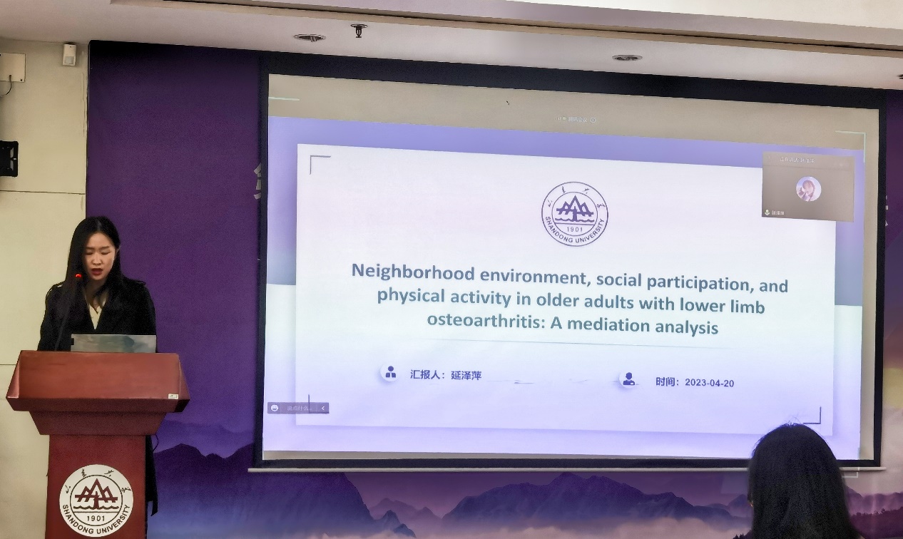 第二位汇报者是2021级博士研究生延泽萍,汇报的文章题目是“Neighborhood environment, social participation, and physical activity in older adults with lower limb osteoarthritis: A mediation analysis”。该研究探索了老年下肢骨关节炎患者邻里环境、社会参与和身体活动之间的关系,通过结构方程模型探索社会参与的中介作用并通过纵向交叉滞后进行验证。研究结果显示,在患有下肢骨关节炎的患者中,社会参与在邻里环境和身体活动间起中介作用,但在健康人群中,社会参与的中介效应并不显著。该研究启示我们,为了促进未来的身体活动,社区社交活动的机会需要重点针对下肢骨关节炎患者。