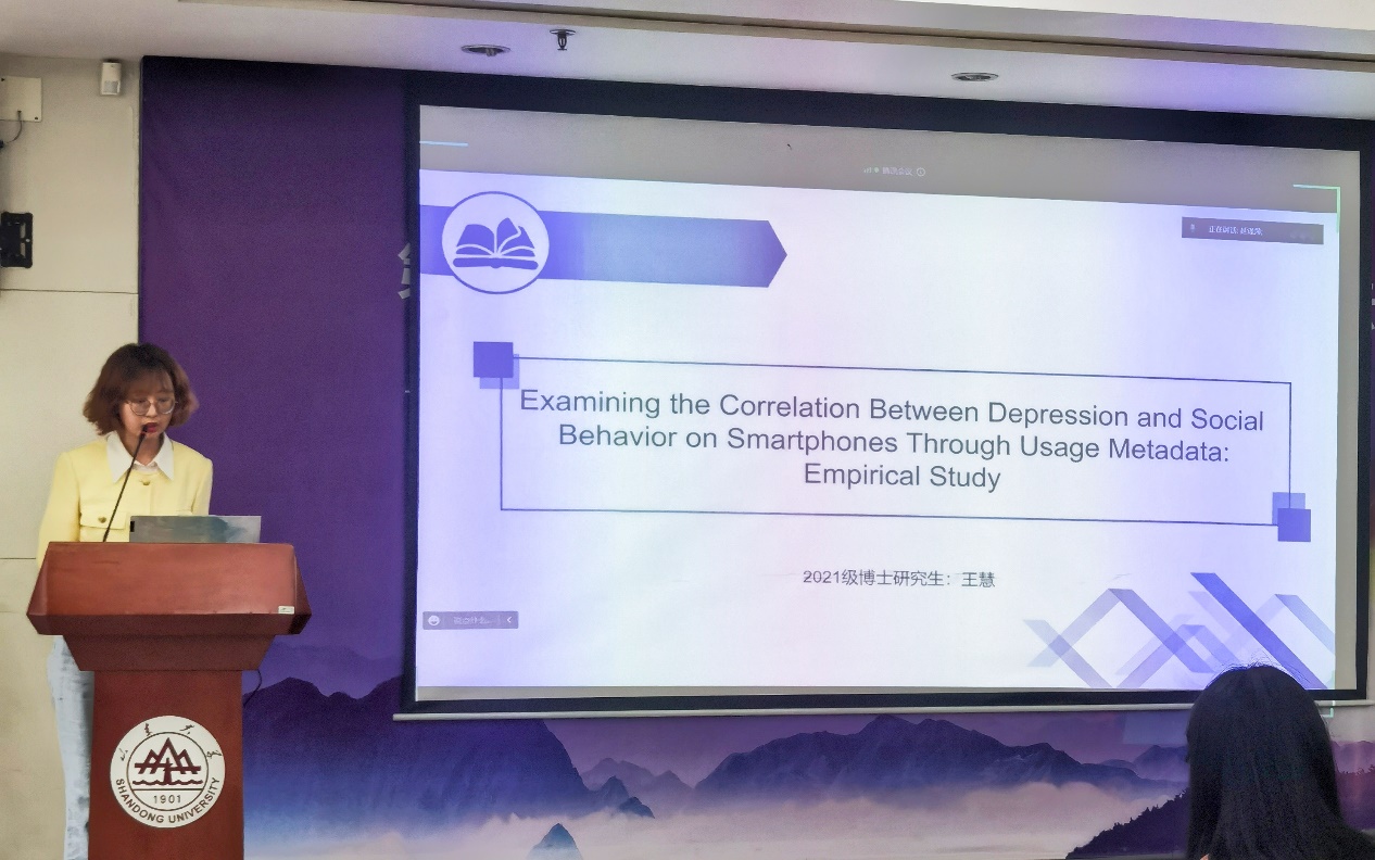 第四位汇报者是2021级博士研究生王慧,汇报的文章于2021年发表在JMIR MHEALTH AND UHEALTH杂志上,题为“Examining the Correlation Between Depression and Social Behavior on Smartphones Through Usage Metadata: Empirical Study”。随着智能手机的广泛使用,了解抑郁症与智能手机上的社交行为之间的关系有利于抑郁症的早期诊断。该研究的目的是通过智能手机收集的元数据来探索中国抑郁症个体在数字空间中的社交行为。研究共招募了120名使用Android手机的用户,试验时间为1个月。研究者使用自主开发的应用程序MobileSens作为数据获取工具,记录用户在使用手机过程中的元数据。在元数据收集结束时,参与者被指示完成流行病学研究中心-抑郁量表(CES-D),并根据得分被分为非抑郁组和抑郁组。研究者定义了8种传统的通讯行为和3种社交应用的使用行为并进行分析。结果发现,与非抑郁症状组的用户相比,抑郁症状组的用户接到来自联系人的电话更少,使用社交应用程序的频率更高。抑郁症状组中女性用户的微博使用频率在各时间段均高于男性。该研究发现,抑郁症和智能手机上的社交行为之间存在一定的关联性,这一结果可能有助于改善抑郁症患者在日常生活中的社会交往,也可能对抑郁症的早期诊断有一定的启示作用。