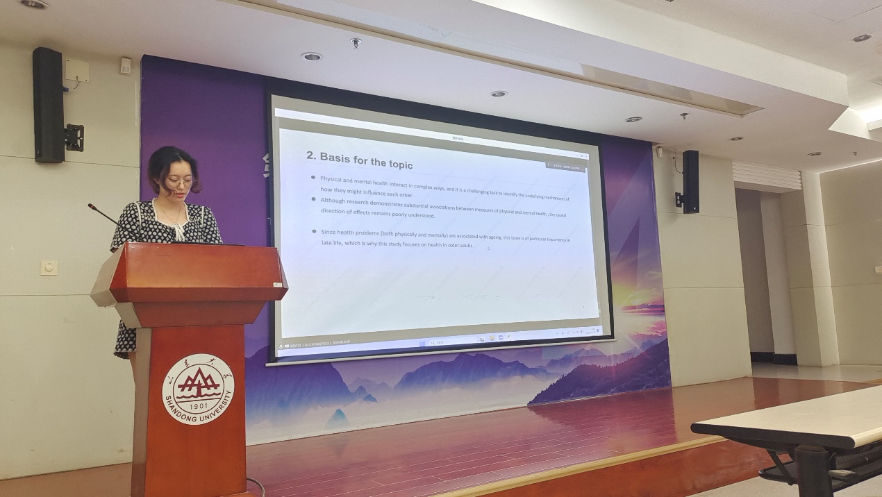 第四位汇报者是2021级硕士研究生刘梦琪,汇报的文章来自Social science & Medicine期刊,题为“Frailty and depression: Reciprocal influences or common causes?”。这项研究采集了欧洲健康、老龄化和退休调查 (SHARE) 中来自多个欧洲国家和以色列的 50 岁及以上老年社区居民的纵向数据,总样本量最终达到58152 人,具有极强的样本代表性。衰弱、抑郁以及人群一般资料分别采用衰弱指数、欧洲抑郁量表、以及一般资料调查量表作为工具进行数据收集。作者采用了基于结构化残差的潜在变量曲线模型构建多层级结构方程模型,以明确分离个体内和个体间效应。除此之外,作者就性别、年龄组和教育水平进行了多组分析,以获得最终的最佳拟合模型,探究模型在不同亚组群体中的适用性。该项研究结果质疑了“衰弱和抑郁各自引发另一变量在未来发展中变化”这一观点,而表明这些身心健康状态的变化可能存在共因或共病的现象。这个发现与先前研究的推理基本一致。尽管如此,当前研究与先前研究的可比性仍受到限制。因为既往大多数研究仅依赖于横断面或两波纵向数据,或者没有明确的将个体内与个体间的变化分开探讨。这篇研究所采用的研究设计非常巧妙,样本的代表性以及统计学上的精益求精使得该研究结果极具权威性,给大家带来研究设计及数据处理等方面的诸多启发。