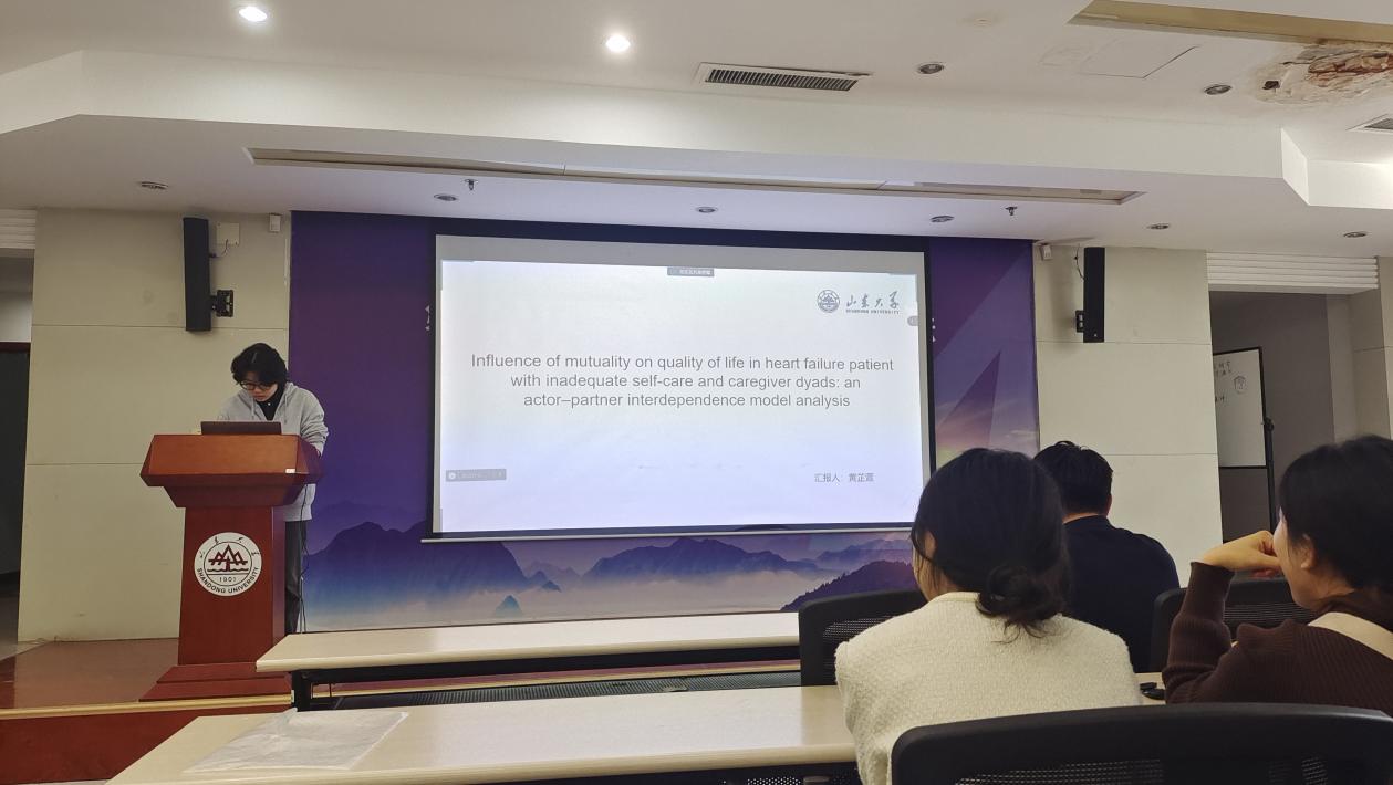 第一位汇报者是2022级硕士研究生黄芷萱,汇报的文章来自于European Journal of Cardiovascular Nursing,题为Influence of mutuality on quality of life in heart failure patient with inadequate self-care and caregiver dyads: an actor-partner interdependence model analysis。相依关系是患者与其非正式照顾者之间关系的积极品质,其特征是爱和情感、共同的愉快活动、共同的价值观和互惠。相依关系会影响慢性病病例中的几种患者-照顾者结局,但尚不清楚它是否影响心力衰竭(HF)患者-照顾者二元生活质量(QOL)。本研究的目的是评估相互性及其四个维度(爱和感情、共同的愉悦活动、共同的价值观和互惠)对心衰患者-照顾者二元组生活质量的影响。使用主客体互倚模型,研究了个体的相依关系如何影响他/她自己的生活质量(主体效应)和他/她的照顾者的生活质量(客体效应)。相依关系和生活质量分别用相依关系量表和SF-12测量。共有494名HF患者-照顾者二元组参加了该研究。该研究结果证实了相依关系在决定心衰患者-照顾者二元组的身体和精神生活质量中的重要作用。该研究表明旨在改善心衰患者护理人员二元关系的干预措施可能会对心衰患者和照顾者的生活质量产生影响。
