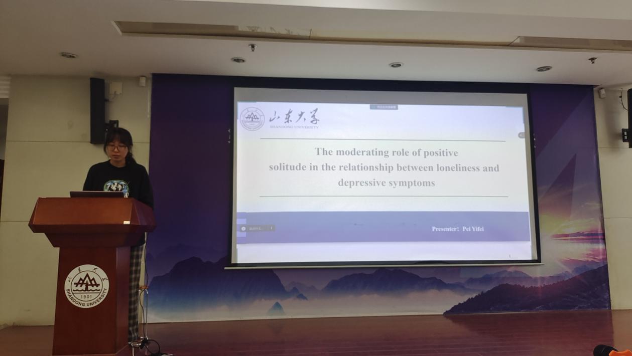 第四位汇报者是2022级硕士研究生裴依斐,汇报的文章来自于International Psychogeriatrics期刊,文献题目为“Let there be light: The moderating role of positive solitude in the relationship between loneliness and depressive symptoms”。积极的独处(PS)被视为一种单独的现象,而不是孤独的对立面,是对独处的一种不同的解释和反应。PS被定义为自愿选择,无论是否有他人在场,参与有意义的活动。PS可以作为一种资源,通过培养内在的力量来抵消孤独。它还可以缓解抑郁症状,促进危机后恢复常规生活的能力。在老年人的背景下,PS被认为可以缓和孤独和抑郁之间的联系。单独花时间会导致抑郁,但从事有意义的活动可以减轻痛苦。这是第一个研究孤独和PS与抑郁症状之间的关系的研究。该研究通过线上问卷调查了以色列65岁以上的老年人群,结果表明PS调节了孤独感与抑郁症状之间的关系。该研究扩展了对孤独感、抑郁症状和PS之间复杂关系的理解,强调了考虑孤独感和PS之间相互作用的重要性。PS是应对孤独感的心理影响的一种有价值的能力。未来可将PS技能培训纳入国家老年人健康促进计划,来提高老年人群体的复原力。